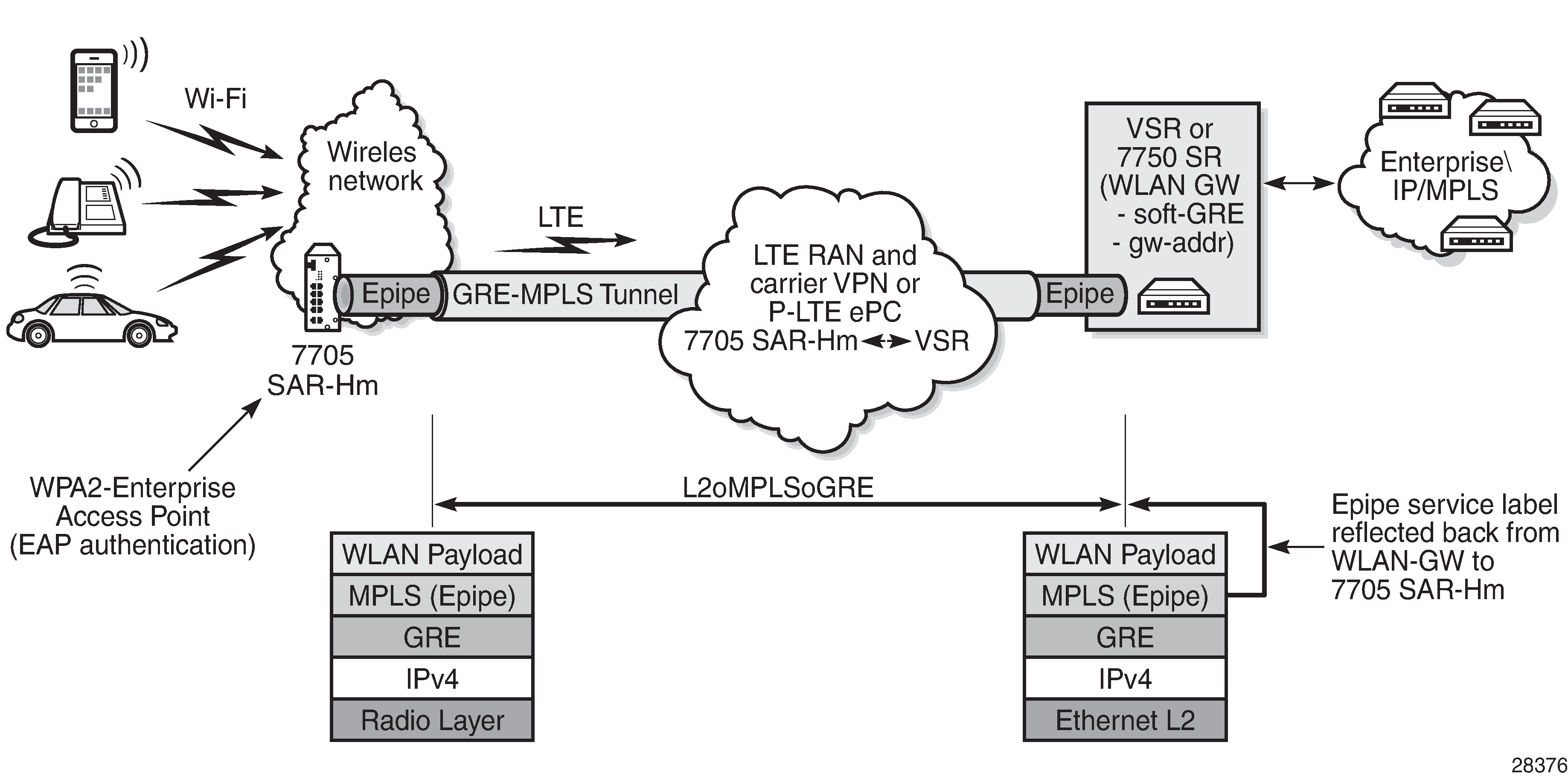 The WLAN interface AP can connect directly to the WLAN Gateway (WLAN-GW) over a Layer 2 Epipe service. For information about the WLAN-GW, see the 7450 ESS, 7750 SR, and VSR Triple Play Service Delivery Architecture Guide, "WiFi aggregation and offload".