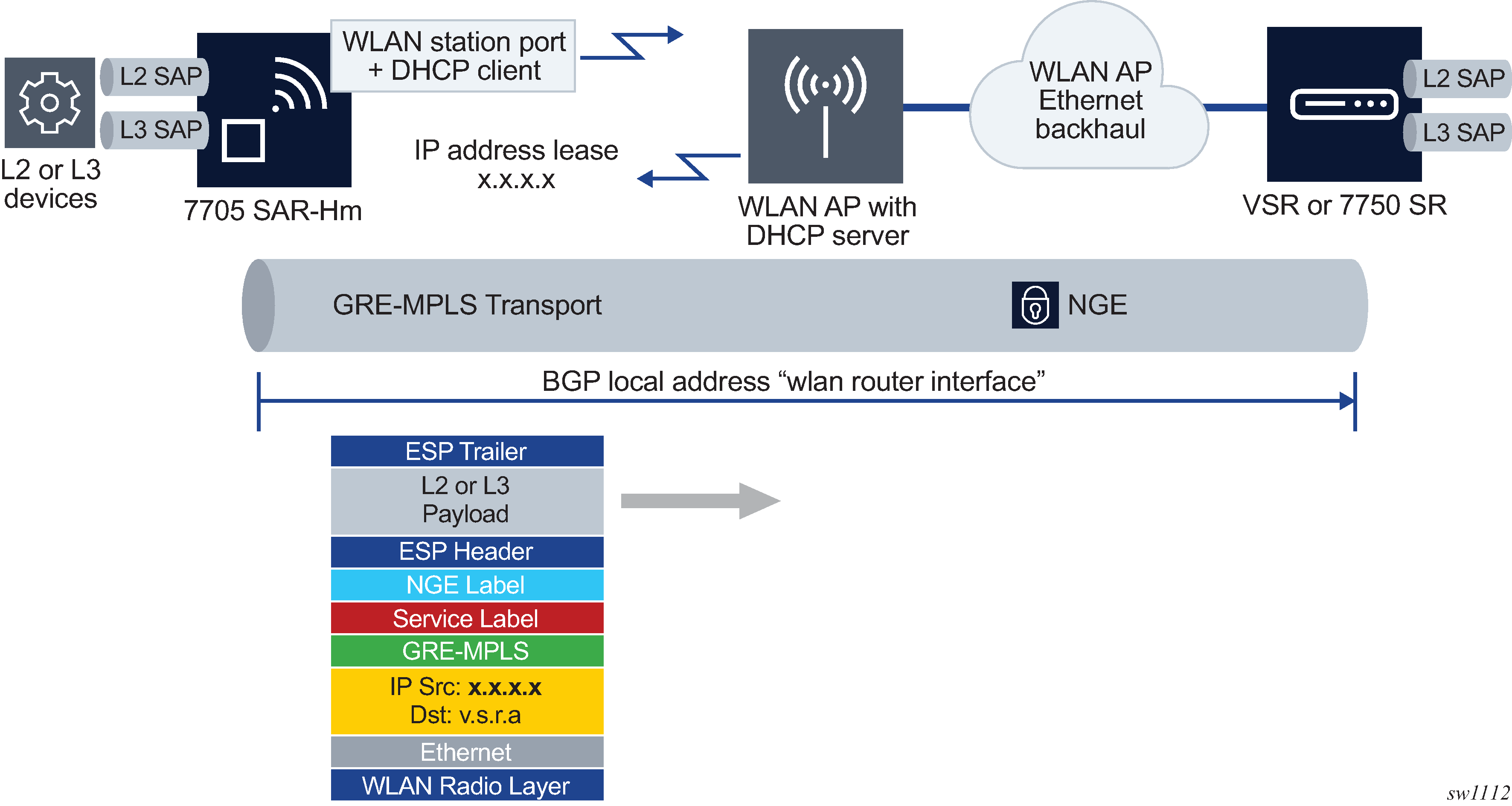 When configured as a station, the WLAN interface operates as a network interface to transport services over WLAN toward a remote AP. The node uses GRE-MPLS encapsulated SDPs to provide Layer 3 transport over the WLAN station interface.
