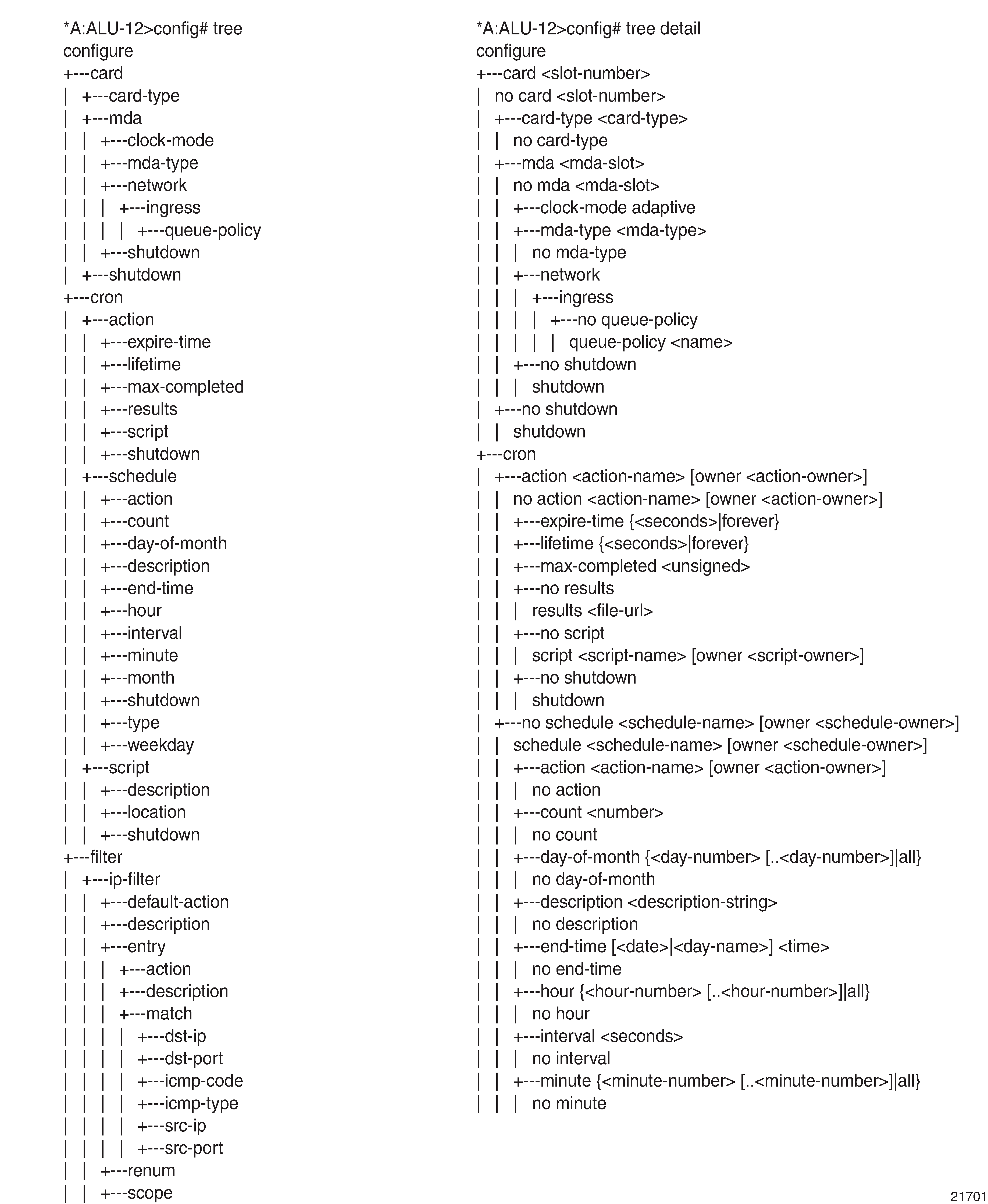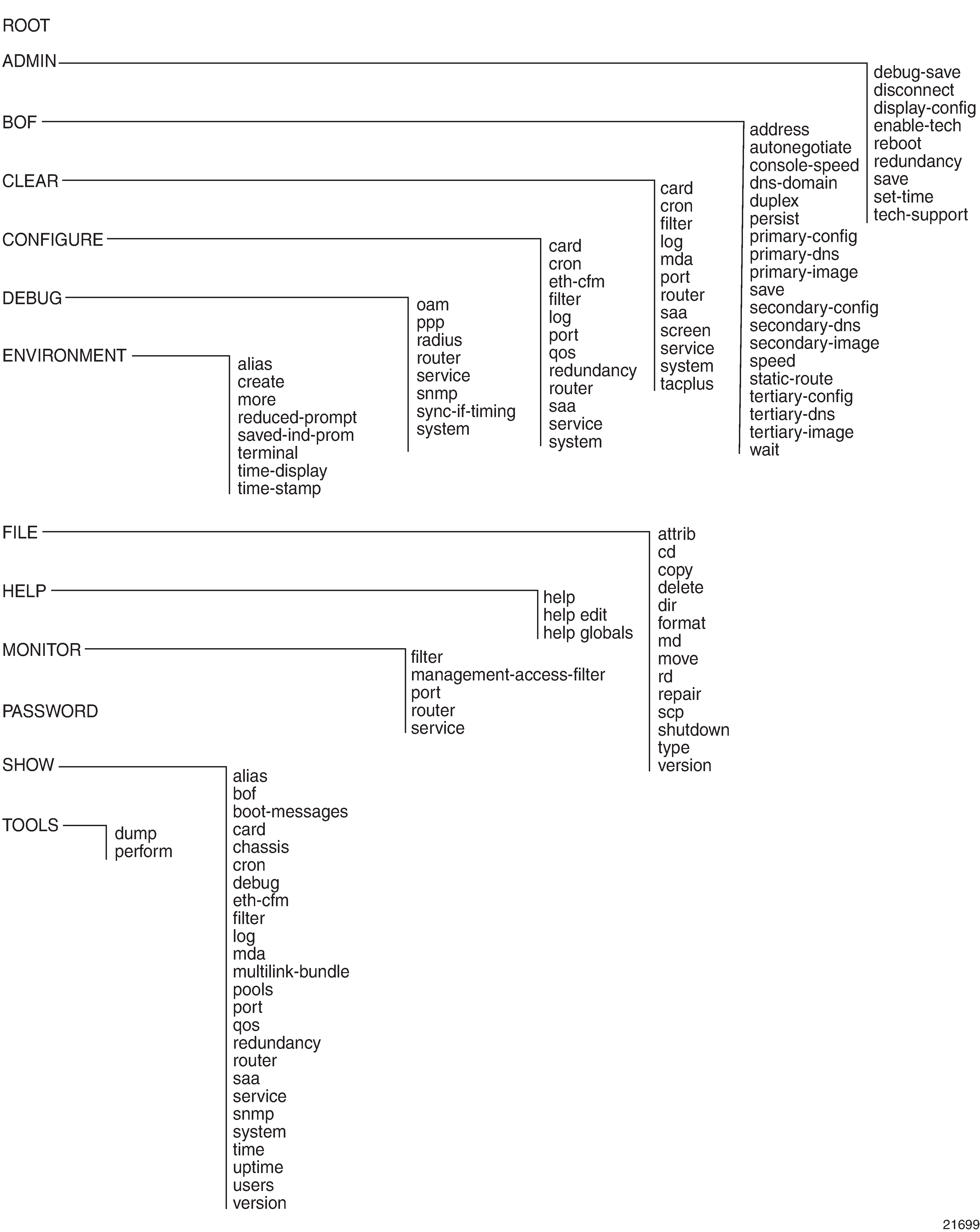 The 7705 SAR CLI command tree is a hierarchical inverted tree. The highest level is the root level. Below this level are other tree levels for the major command groups; for example, configure commands and show commands are below the root level.