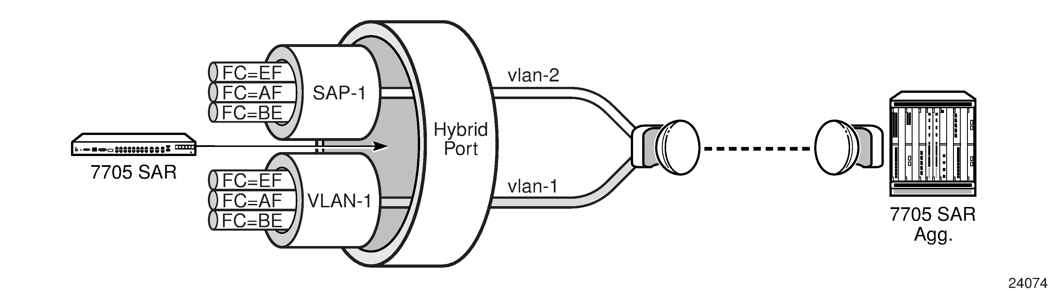 Hybrid ports are configured for access (customer-facing) and network-facing traffic. Hybrid ports can support access and network modes simultaneously over different VLANs. Within the span of a port, some of the VLANs can be in access mode and associated with SAPs for various services, while other VLANs can be in network mode and support any of the network-side operations, including label switching, IP forwarding (GRT IP routing), GRE SDPs, and so on.