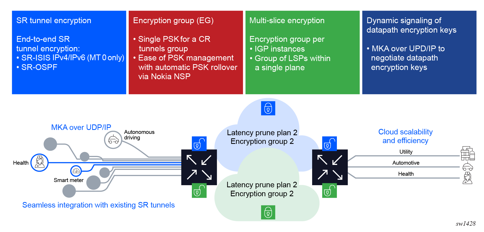 - At the MKA signaling layer, ANYsec supports assigning the PSKs and the CAs to a group of segment routing (SR) tunnels. This assignment is known as encryption groups (EG) in ANYsec. Encryption groups support easy management of PSKs for ANYsec tunnels, because multiple tunnels can use the same PSK.