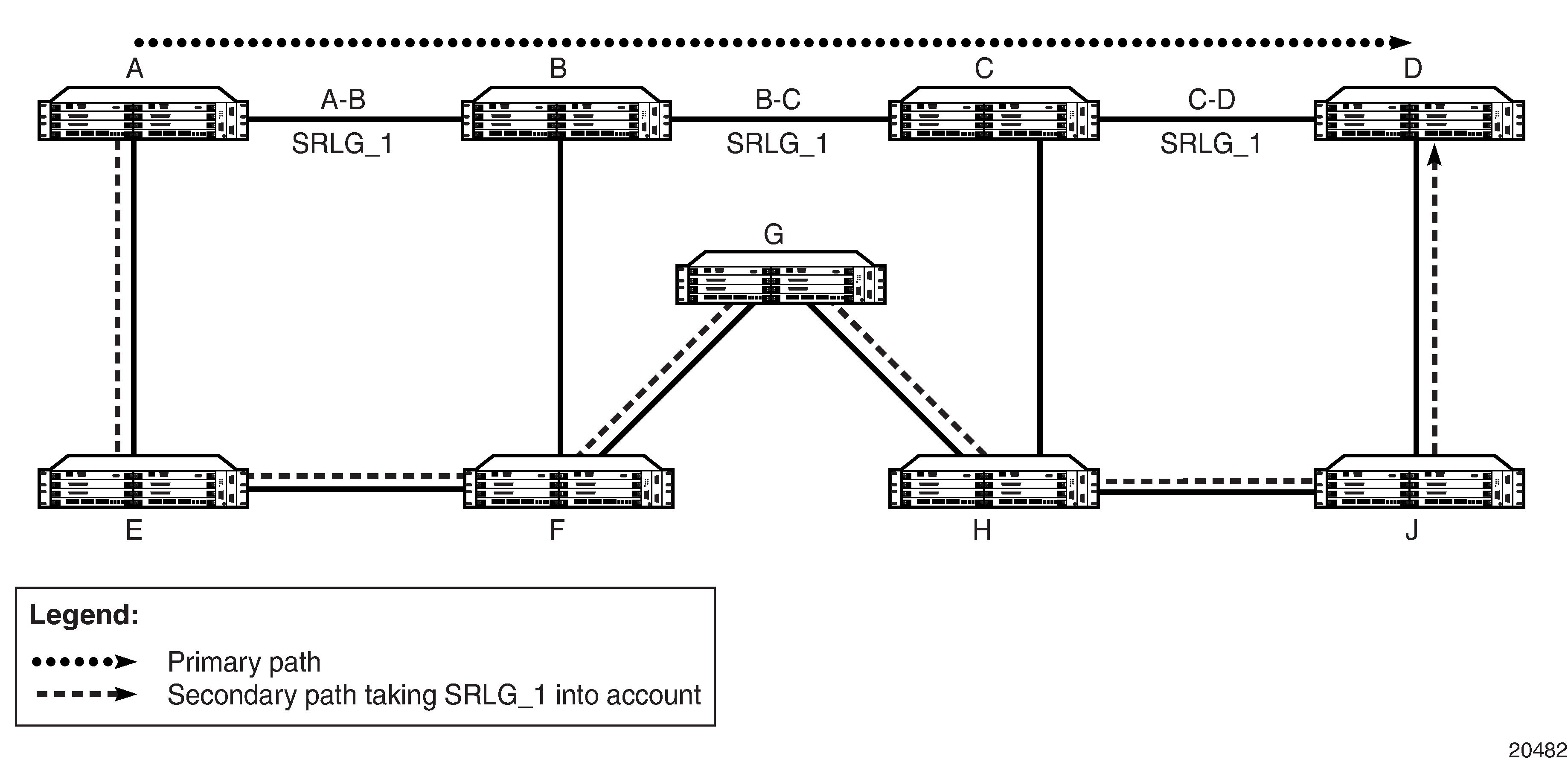 The LSP redundancy and FRR features have the ability to take shared risk link groups (SRLGs) into consideration when the constrained shortest path first (CSPF) algorithm is used to determine an alternate LSP. The selection of a route is determined by the IGP-TE protocol. The added constraints imposed by SRLGs and CSPF ensure that the redundant route selected will be unique from the principal route (route being protected); that is, it will use physical equipment that is different from the equipment that carries the principal route. CSPF will constrain the alternate route to be the shortest possible alternative route. There may be more than one alternative route.