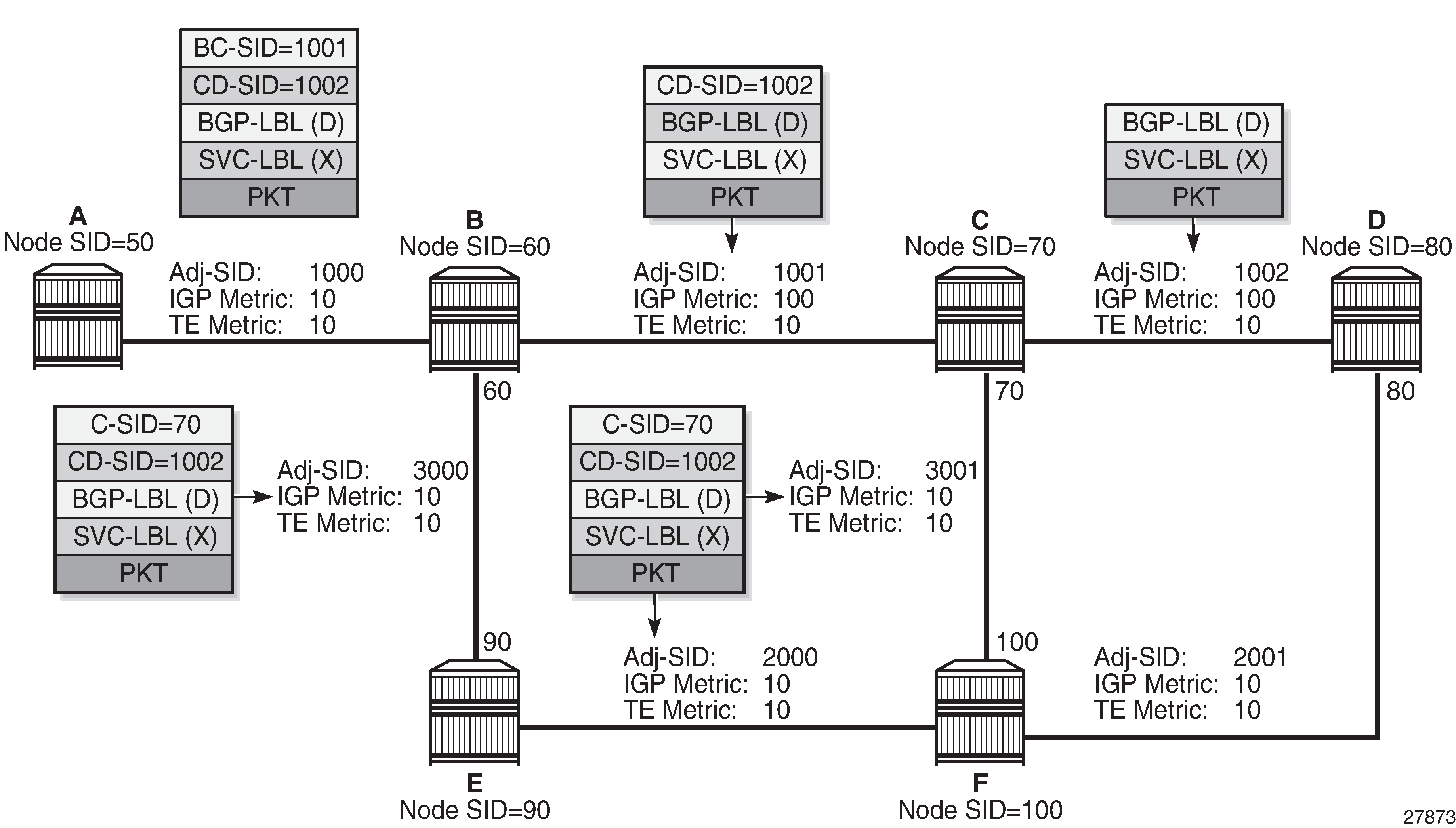 At the iLER, the insertion of the entropy label into the label stack is enabled using the entropy-label command under the service, mesh SDP, or spoke SDP context or under the config>router>isis (or ospf)>segment-routing context for SR-TE LSPs.
