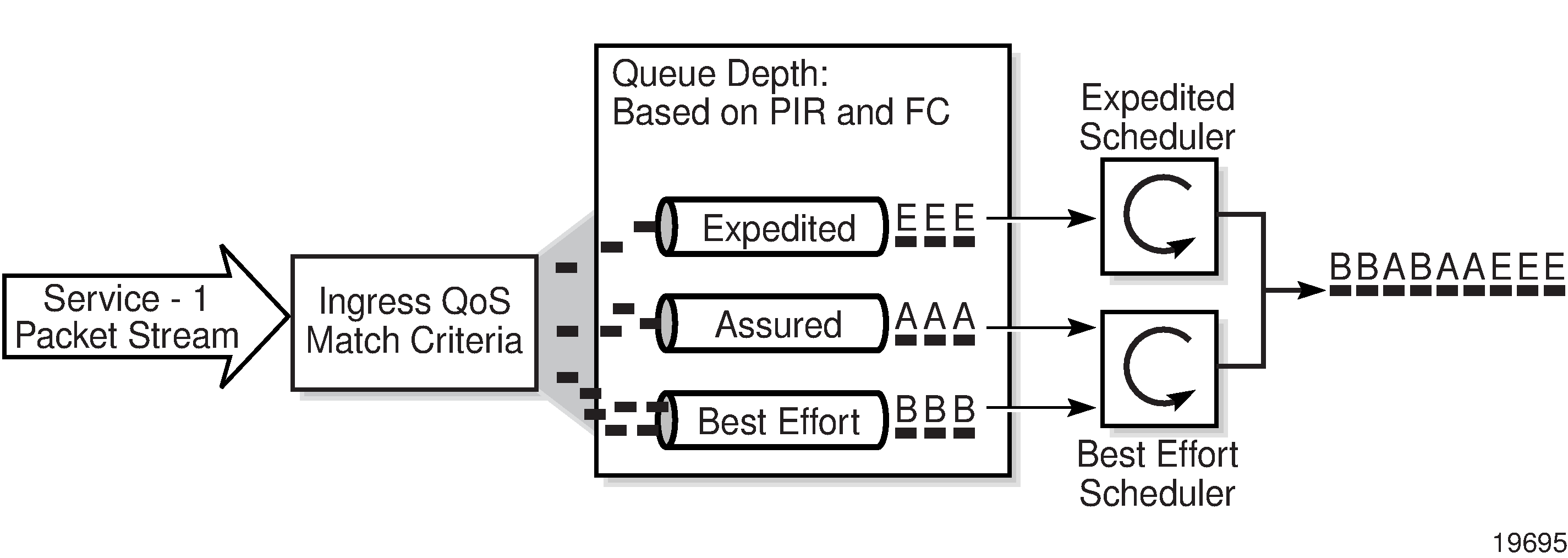 Each forwarding class is important only in relation to the other forwarding classes. A forwarding class allows network elements to weigh the relative importance of one packet over another. With such flexible queuing, packets belonging to a specific flow within a service can be preferentially forwarded based on the CoS of a queue. The forwarding decision is based on the forwarding class of the packet, as assigned by the ingress QoS policy defined for the service access point (SAP).