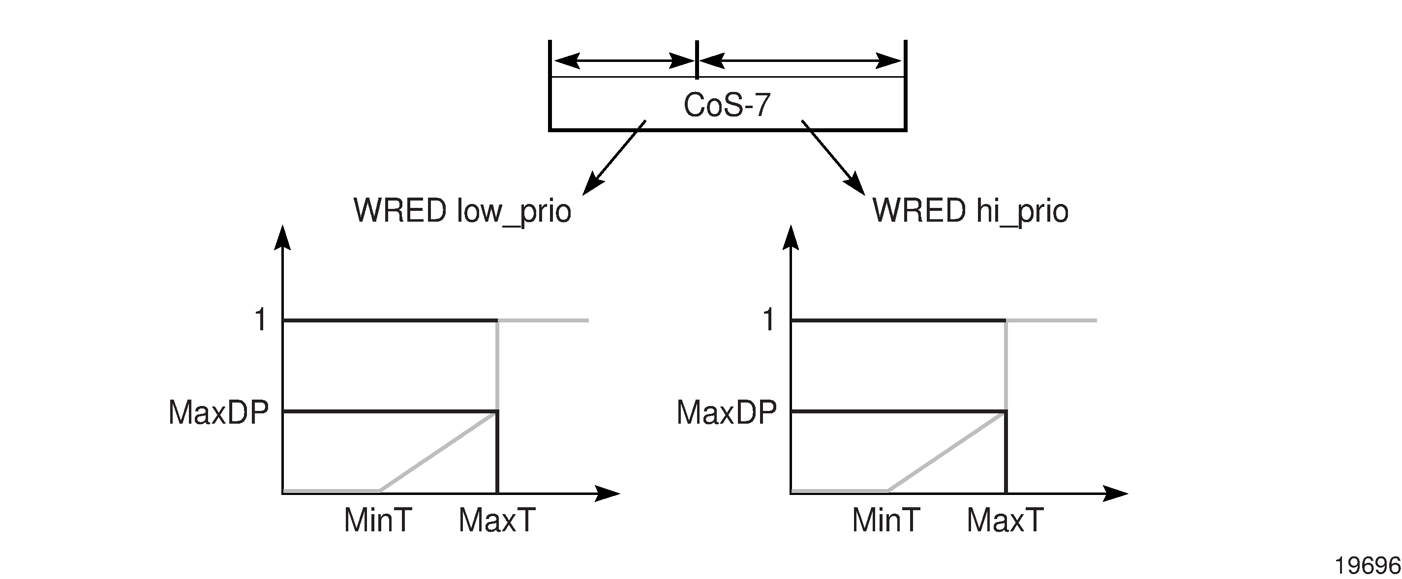 WRED slope curves can run against high-priority and low-priority traffic separately for ingress and egress queues. This allows the flexibility to treat low-priority and high-priority traffic differently. WRED slope policies are used to configure the minT, maxT and maxDP values, instead of configuring these thresholds against every queue. It is the slope policies that are then applied to individual queues. Therefore, WRED slope policies affect how and when the high-priority and low-priority traffic is discarded within the same queue.
