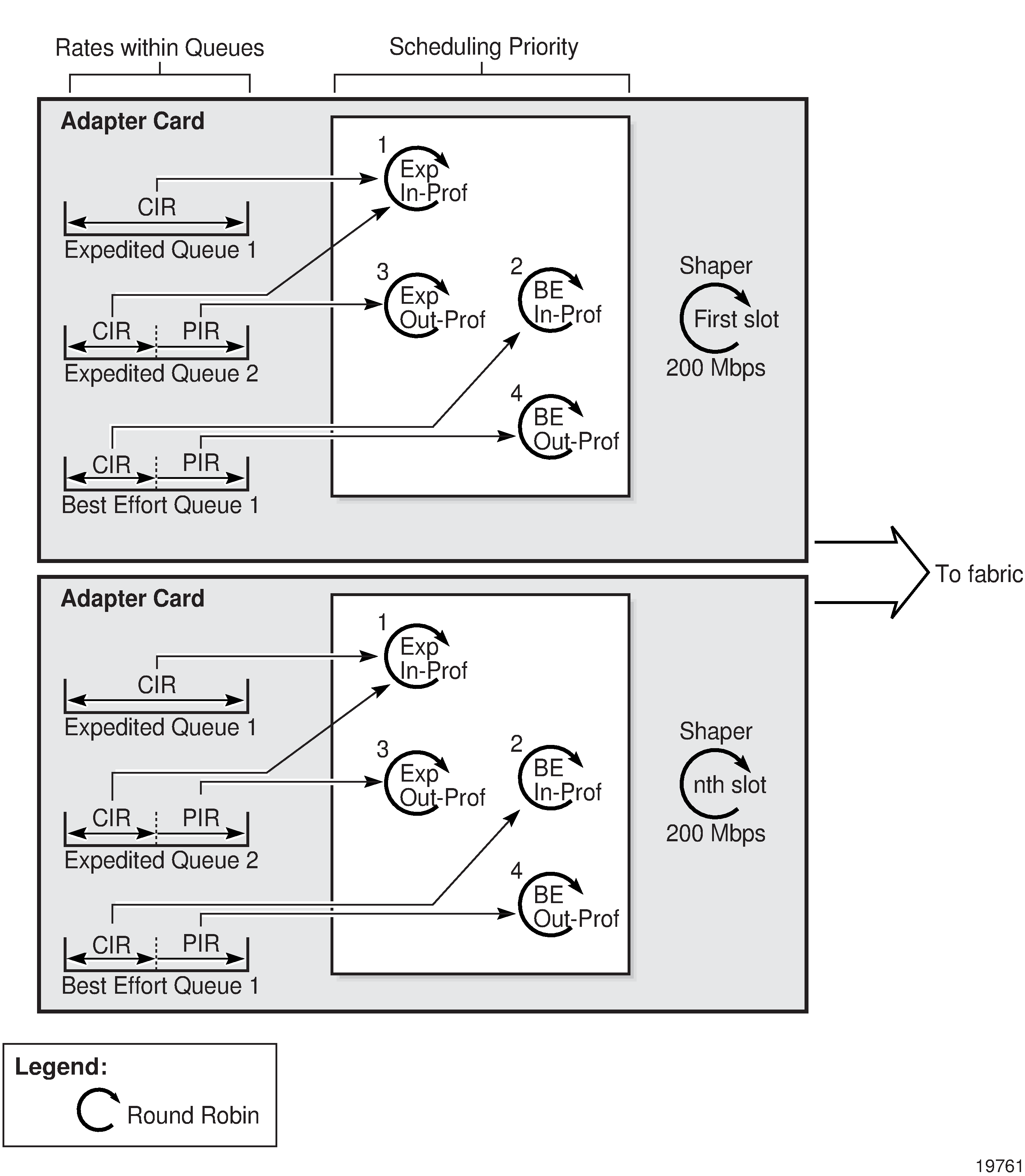 With priority mode, an access packet’s in-profile or out-of-profile state is based on the dynamic rate of the ingress queue before being forwarded to the fabric. When the queue rate is lower than or equal to the configured CIR, the packet is considered in-profile. When the queue rate is higher than the CIR, the packet is considered out-of-profile. The profile state is determined when the packet is scheduled out of the queue, not when the packet is buffered into the queue.