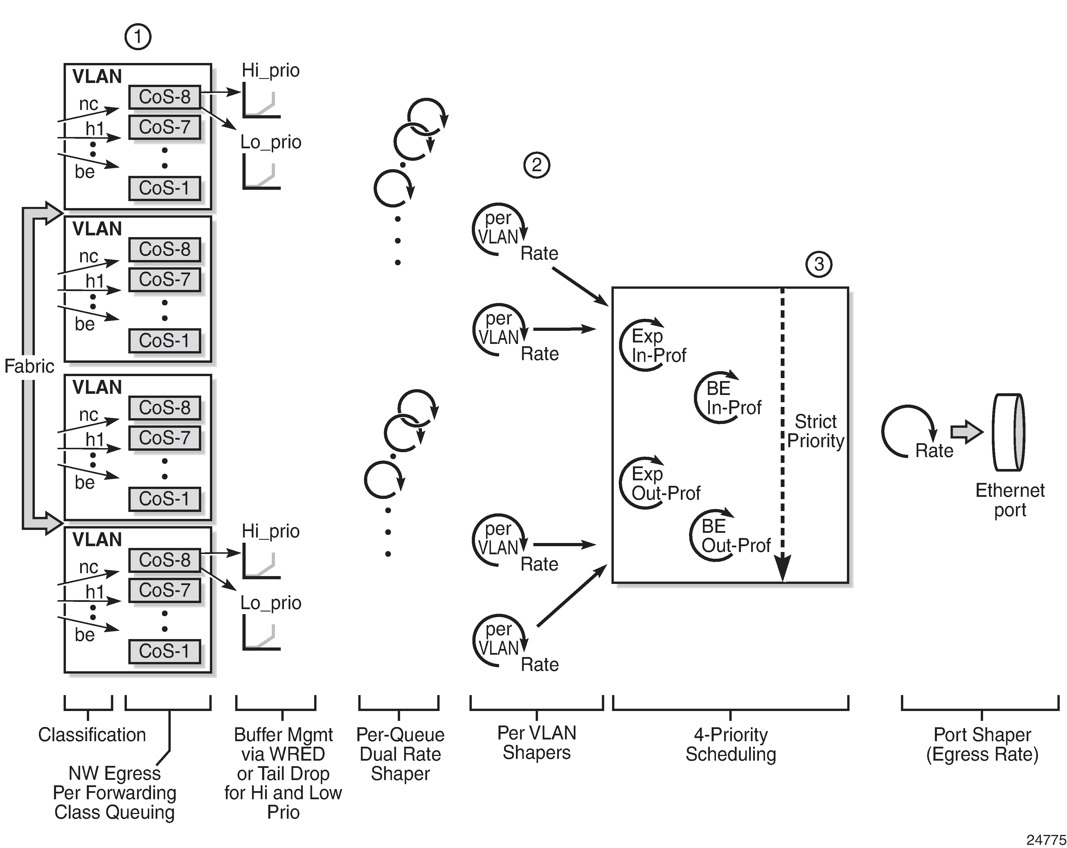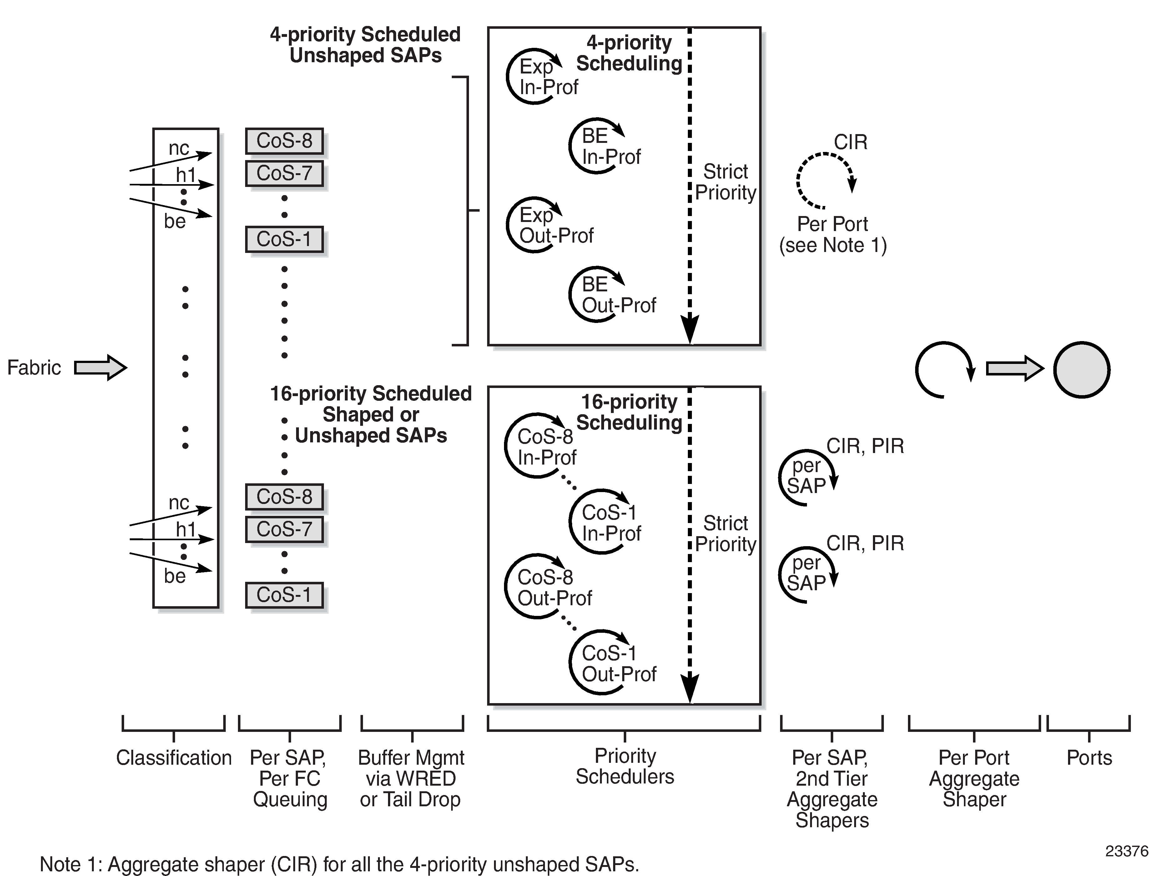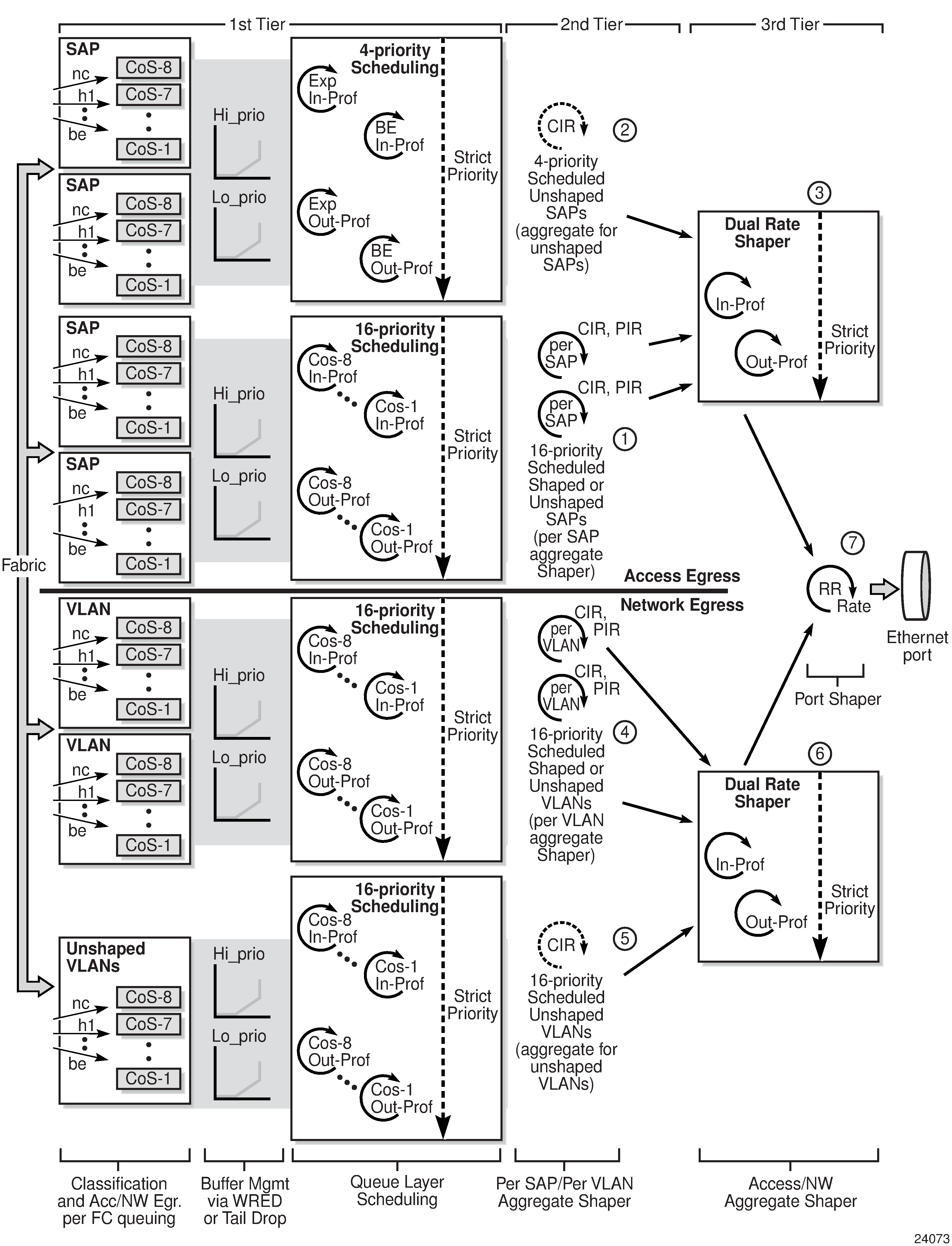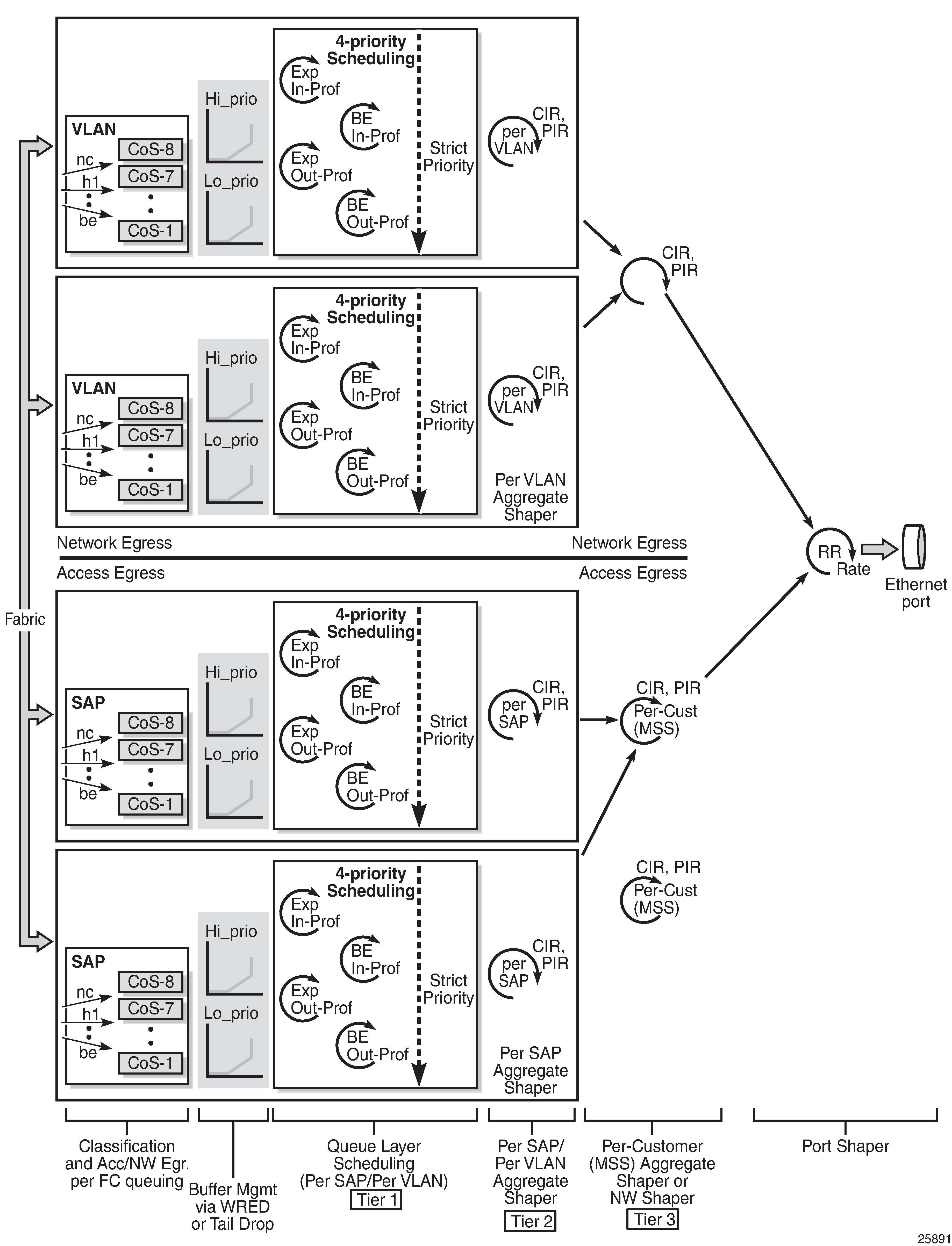 See Per-SAP aggregate shapers (H-QoS) on Gen-2 hardware and Per-VLAN network egress shapers for details on per-SAP and per-VLAN shapers.