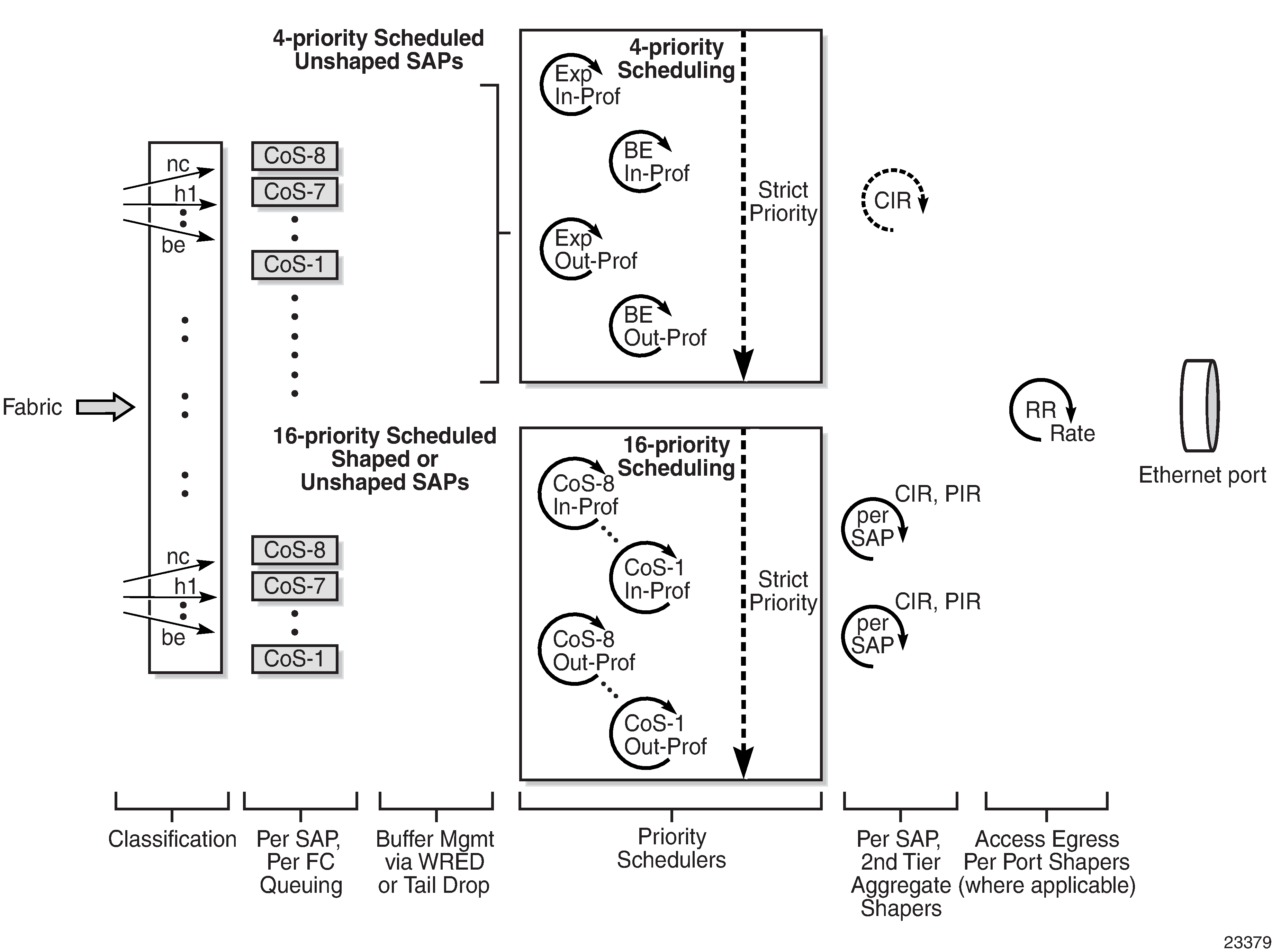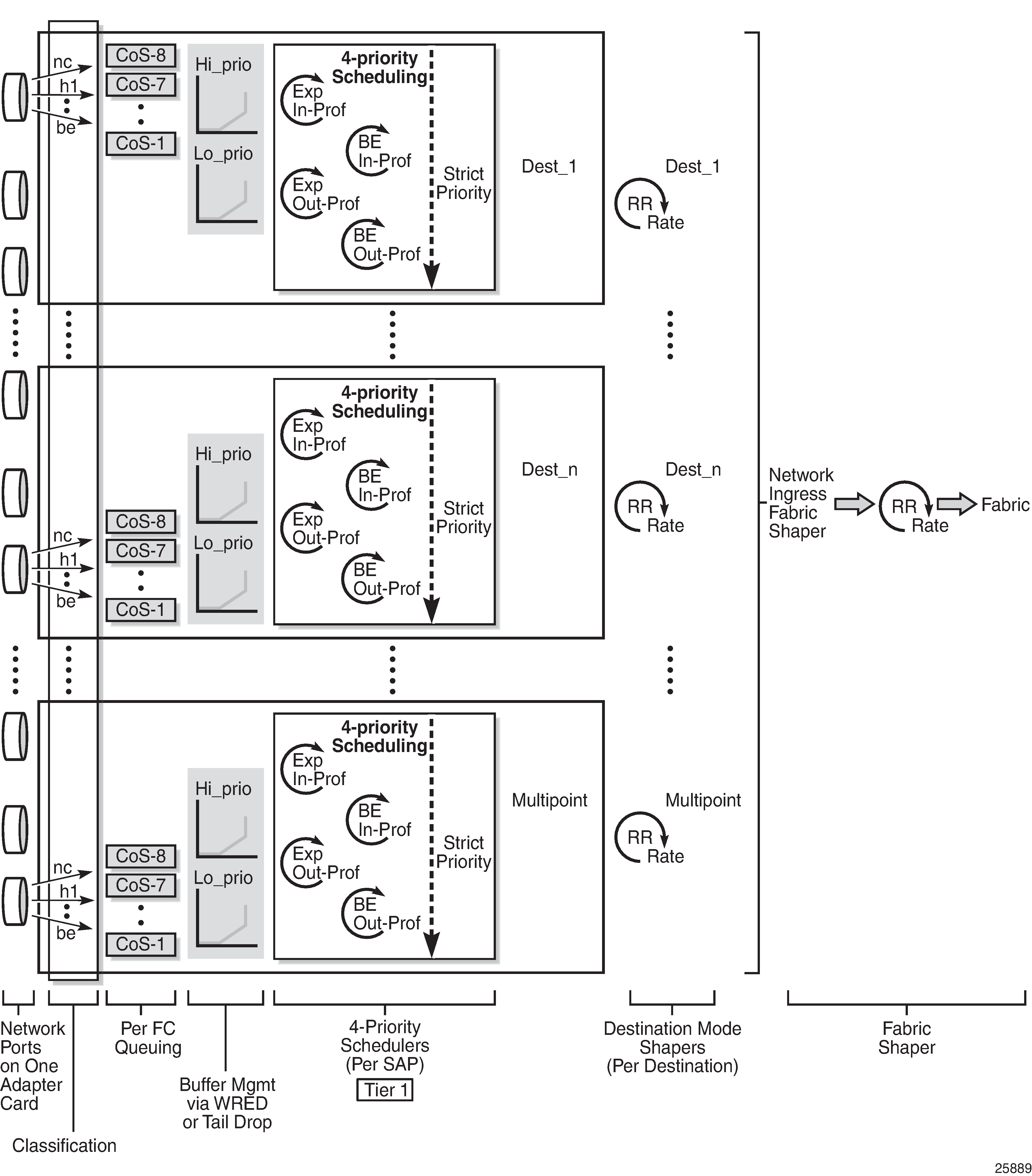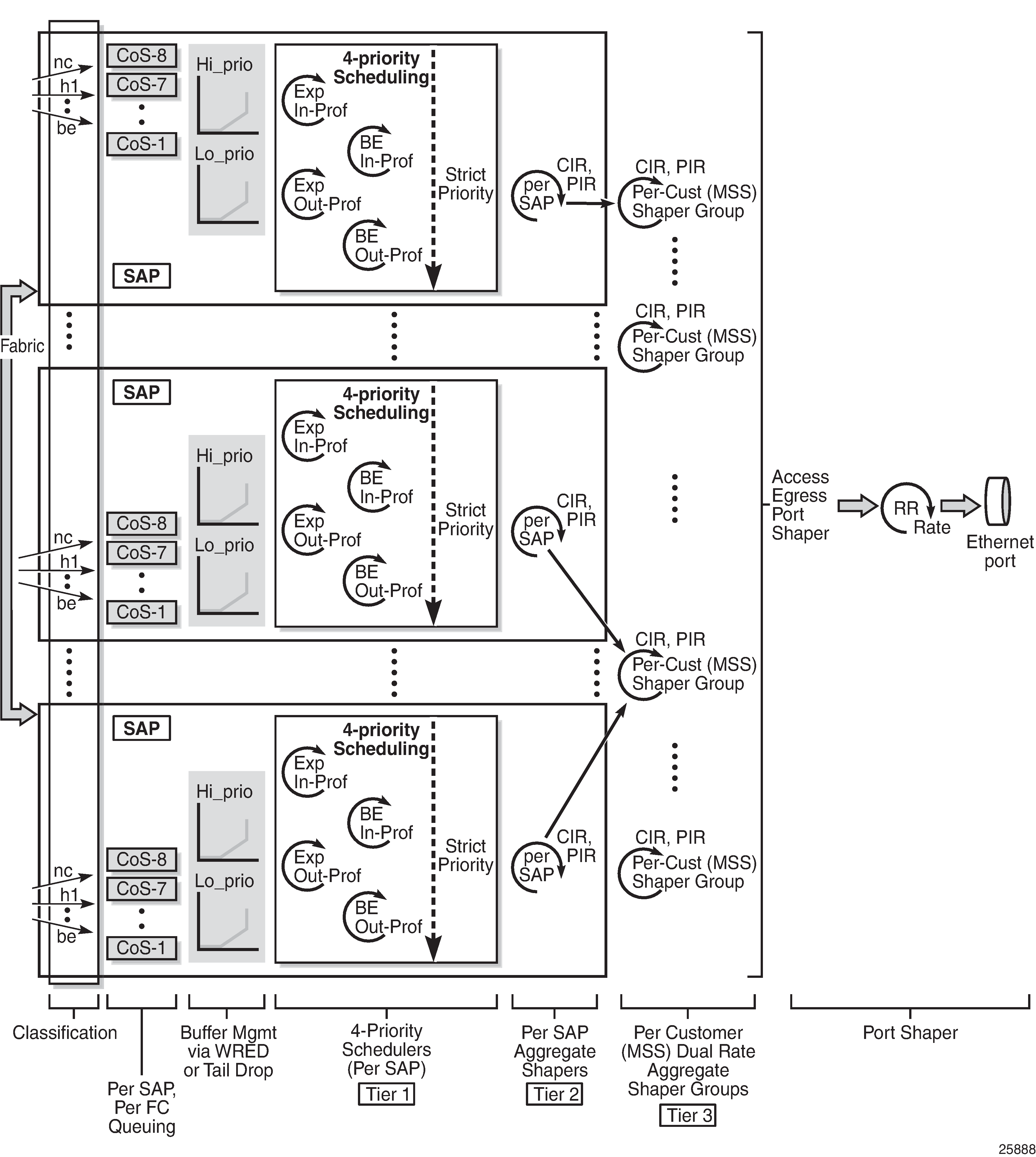 See Per-SAP aggregate shapers (H-QoS) on Gen-2 hardware and Per-VLAN network egress shapers for details on per-SAP and per-VLAN shapers.