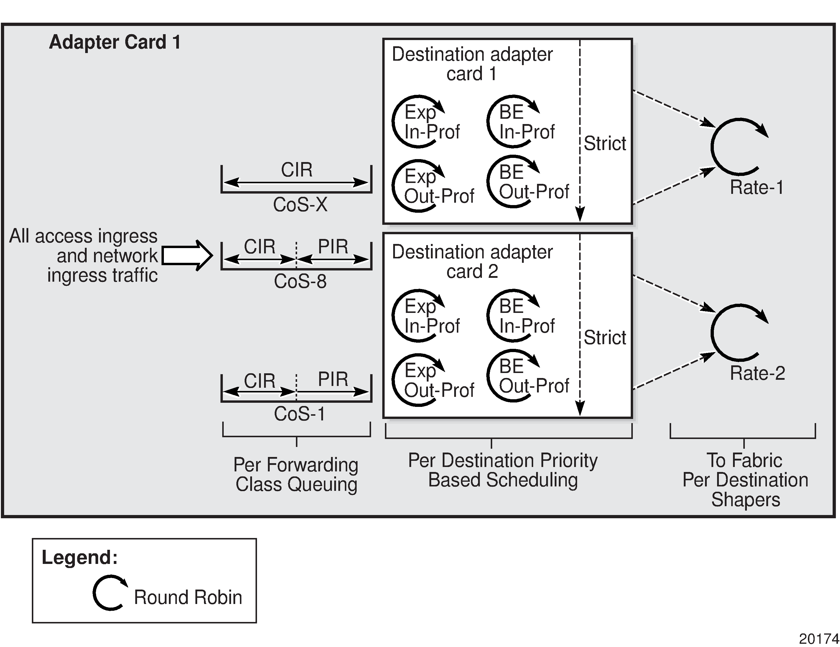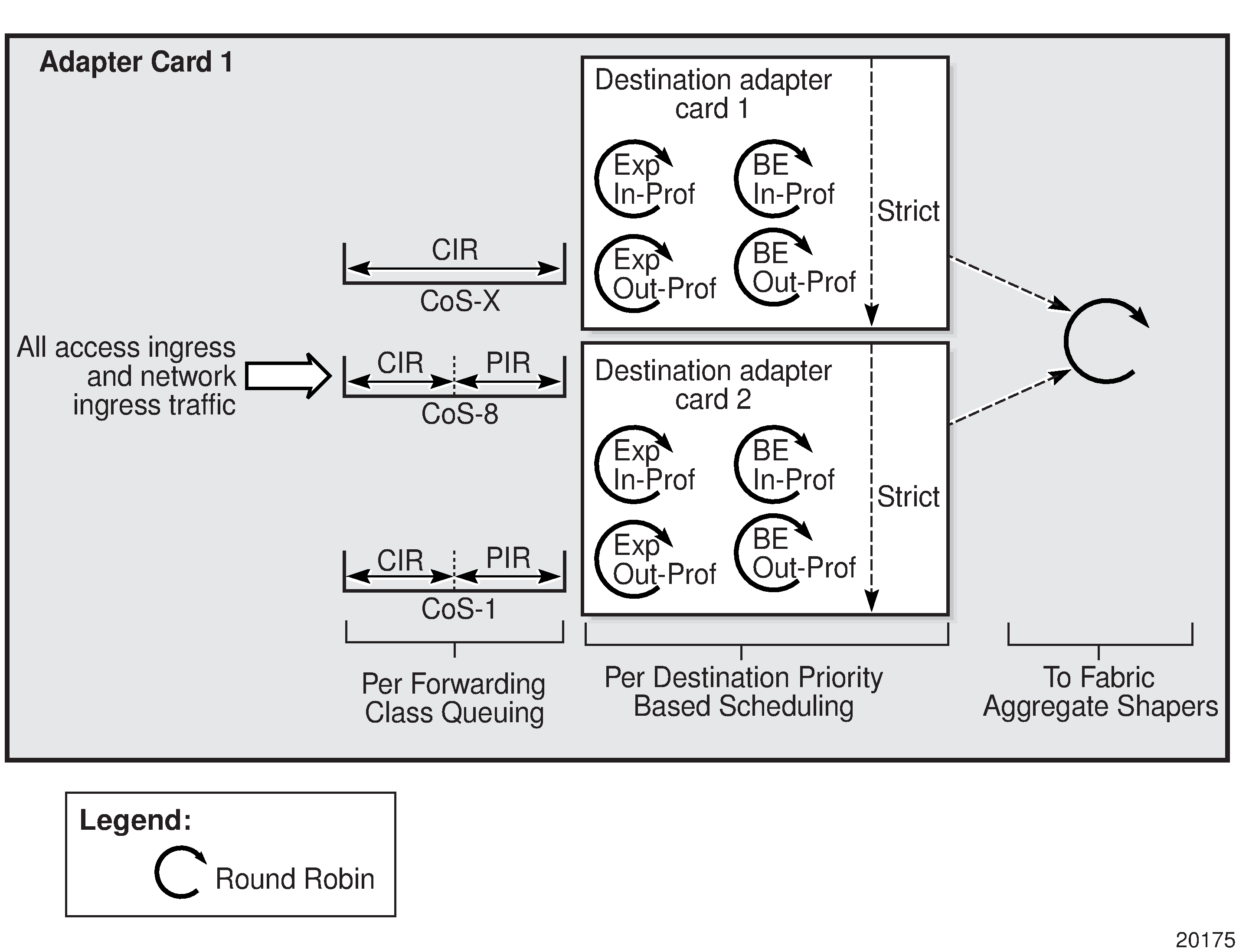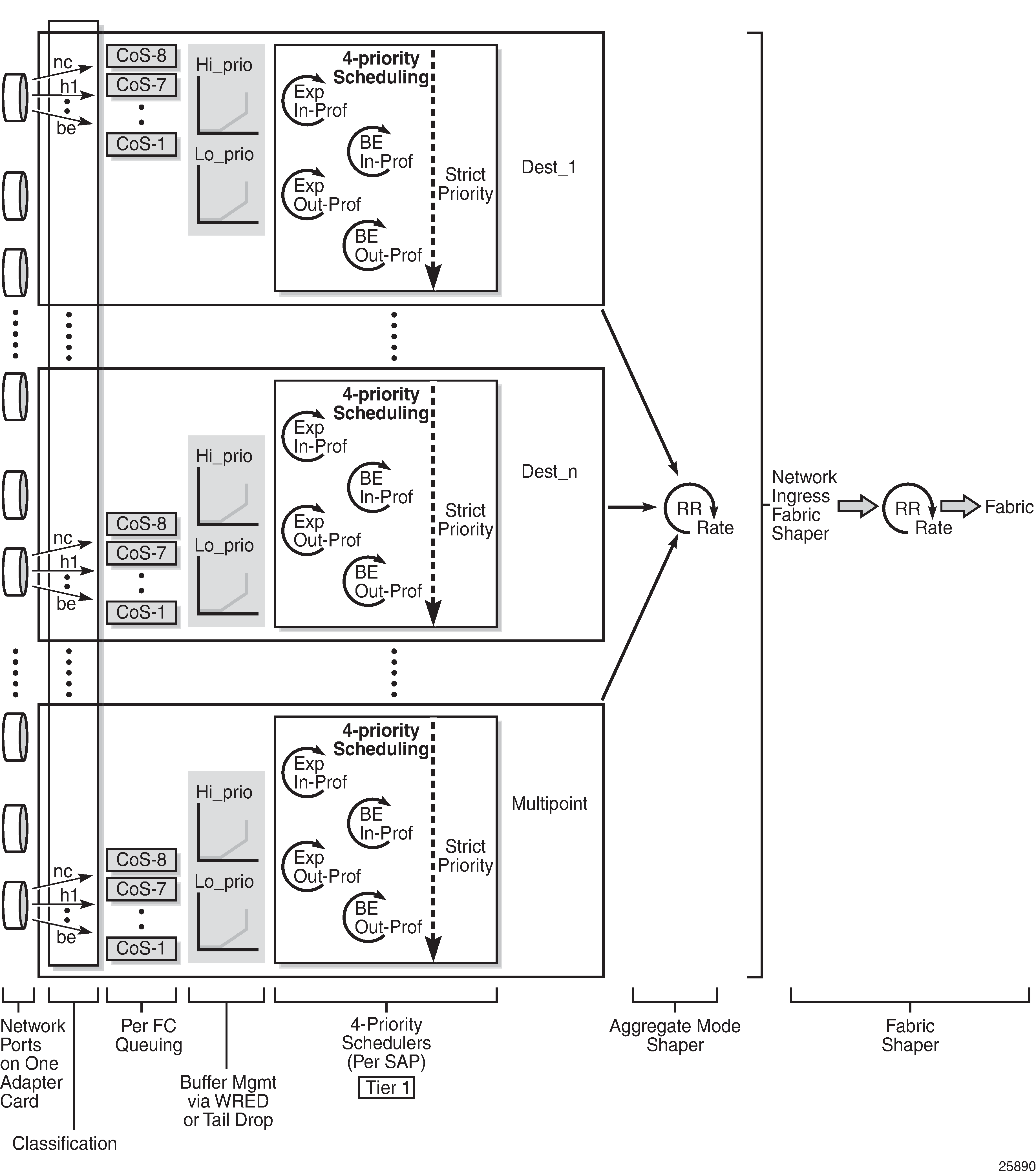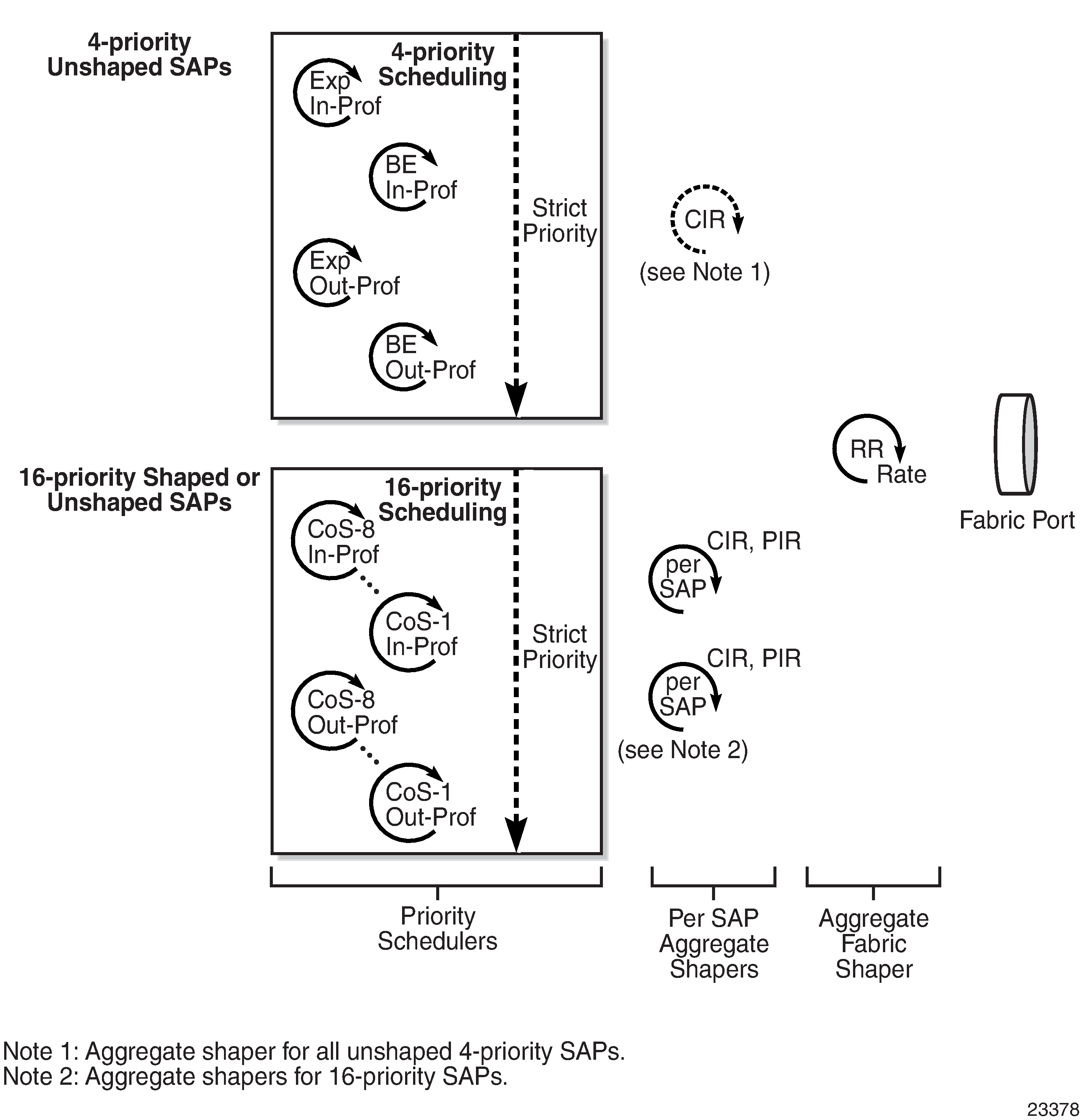 See Per-SAP aggregate shapers (H-QoS) on Gen-2 hardware and Per-VLAN network egress shapers for details on per-SAP and per-VLAN shapers.