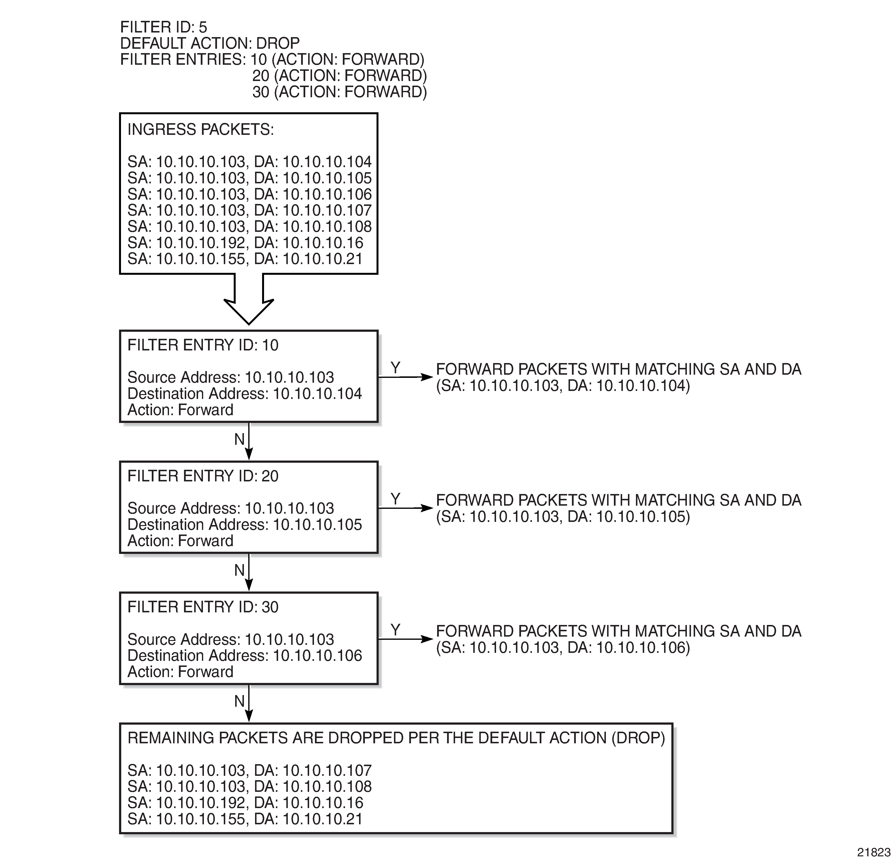 Filter entry matching criteria can be as general or specific as required, but all conditions in the entry must be met in order for the packet to be considered a match and the specified entry action performed. The process stops when the first complete match is found and the action defined in the entry is executed (that is, packets that match the criteria are either dropped or forwarded).