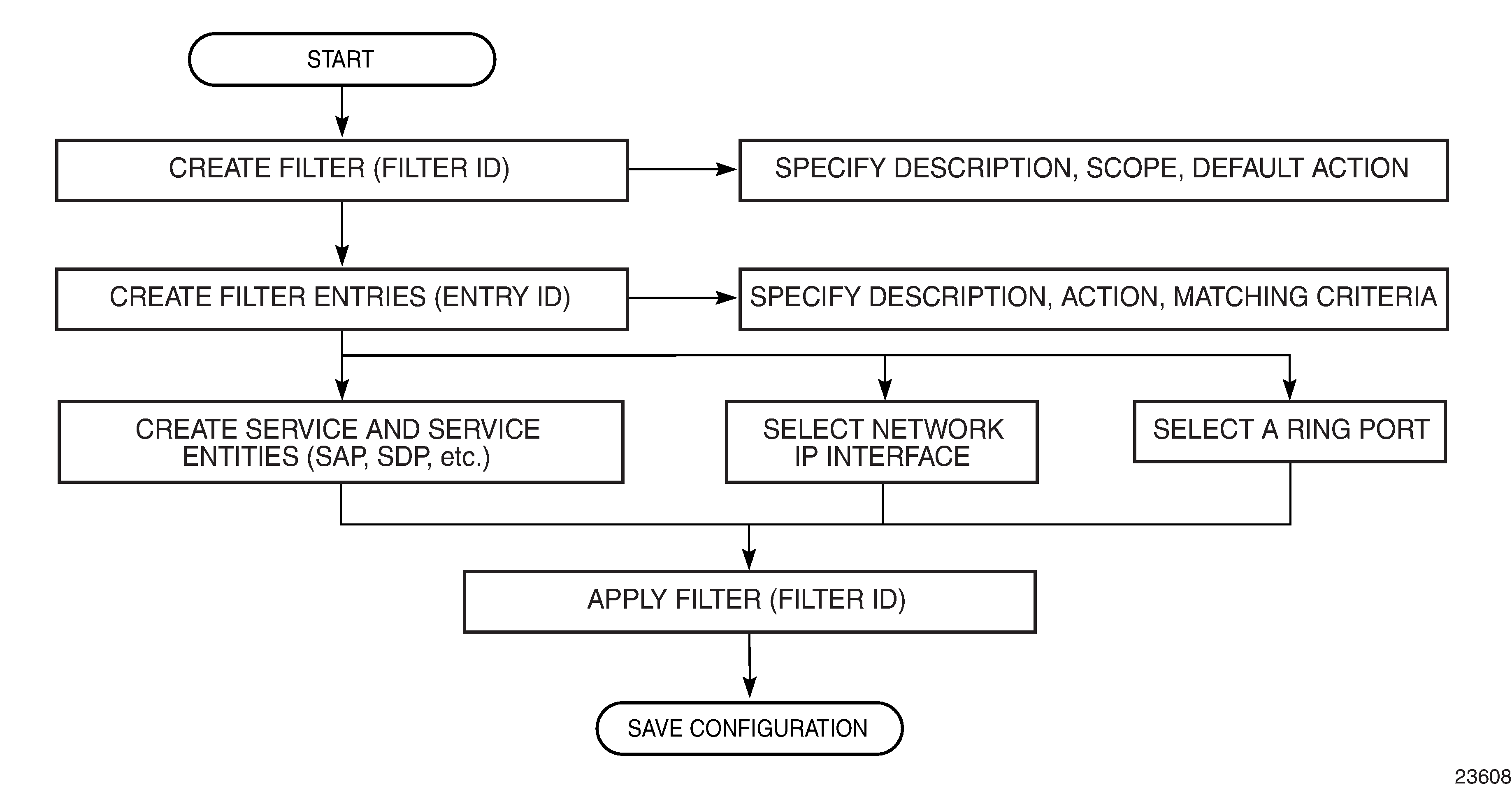 Configuring an entity for a filter policy is optional. If a network or service interface is not configured with filter policies, all traffic is allowed on the interface. By default, there are no filters associated with interfaces or services. The filters must be explicitly created and associated. When you create a new filter, you must specify a unique filter ID value for each new filter policy, as well as each new filter entry and associated actions. The filter entries specify the filter matching criteria. See Filter policy entries. After creating a filter policy you can also, optionally, assign filters a unique name. Filter IDs or filter names can be used throughout the system to manage filter policies and assign them to interfaces.