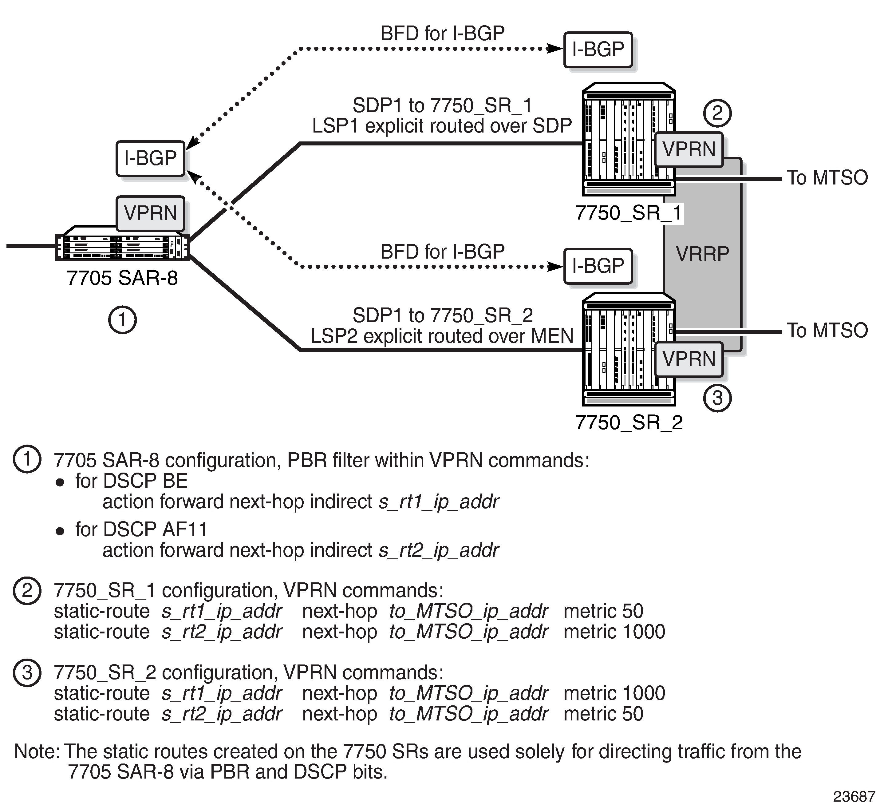 The 7705 SAR also supports policy-based routing (PBR), which is based on IP filters, and multi-field classification (MFC).