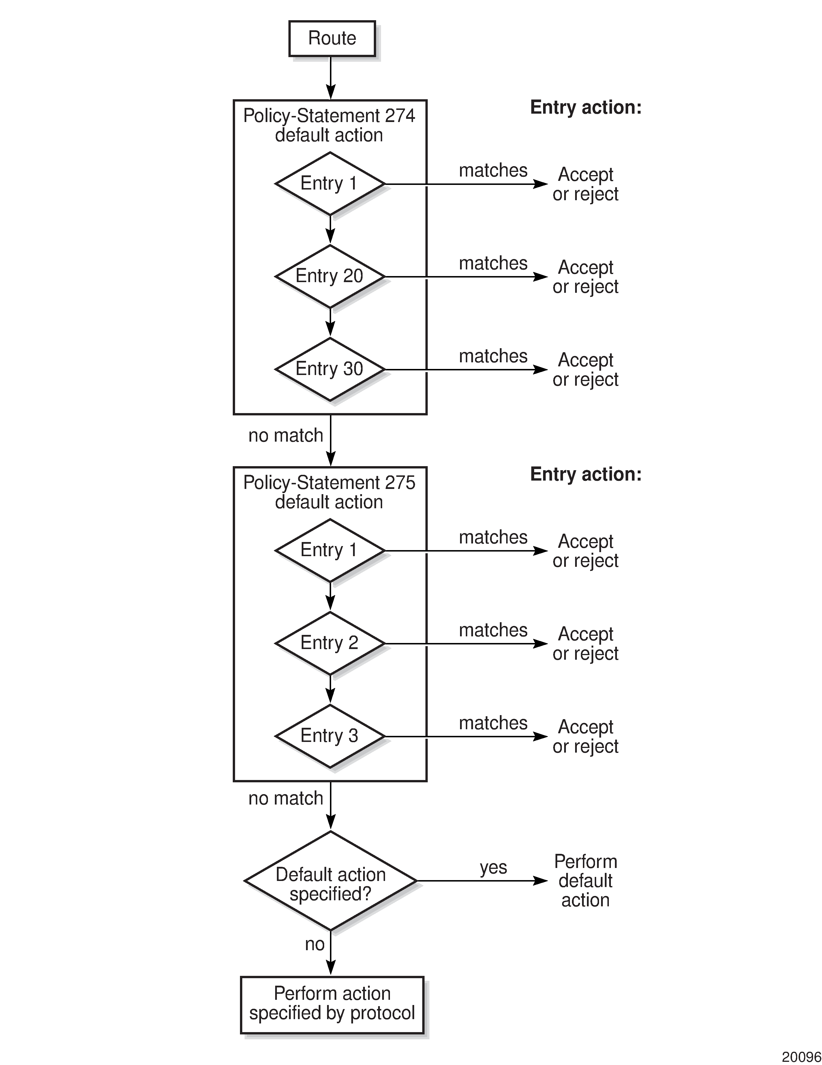 The default action of a policy applies to a route when the route does not match any of the entries of the policy. If a policy does not have any match entries, all routes are subject to the default action. If no default action is specified and the policy is the last one in a chain of policies, the default action is determined by the protocol that called the policy.