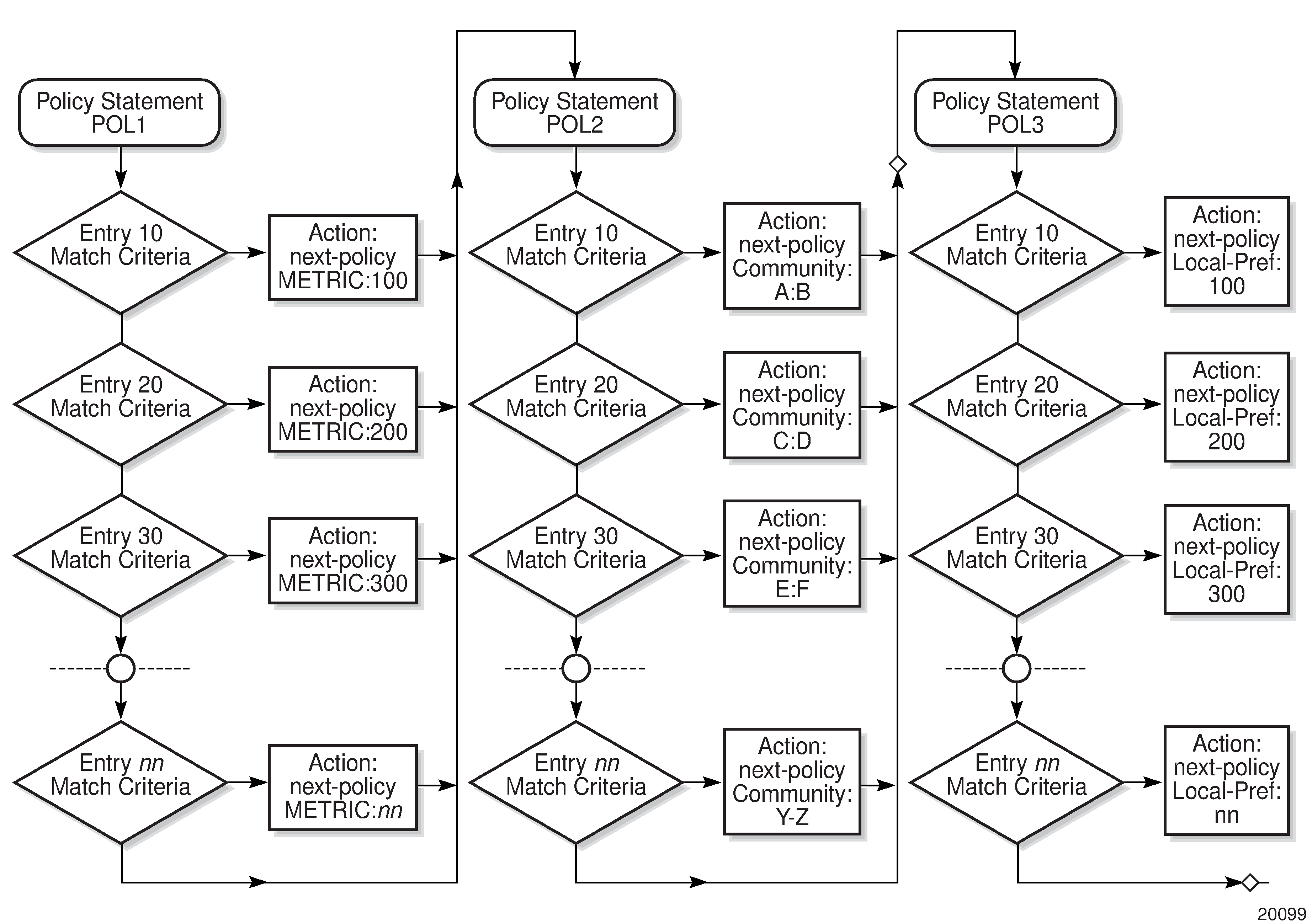 The process can stop when the first complete match is found and the router executes the action defined in the entry, either to accept or reject packets that match the criteria or proceed to the next entry or the next policy. Matching criteria can be based on source, destination, or particular properties of a route. Route policies can be constructed to support multiple stages to the evaluation and setting various route attributes.