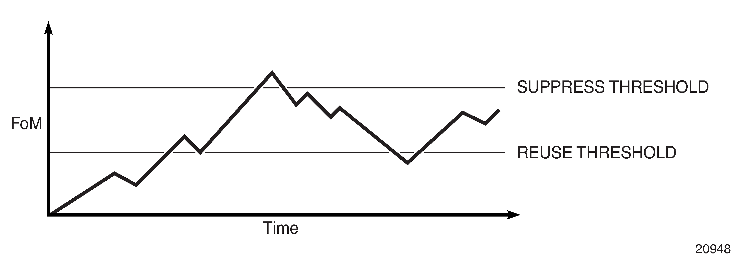 reuse threshold – when the FoM value falls below the configured reuse threshold and the route is still reachable, the route is advertised to other peers. The FoM value decays exponentially after a route is suppressed.