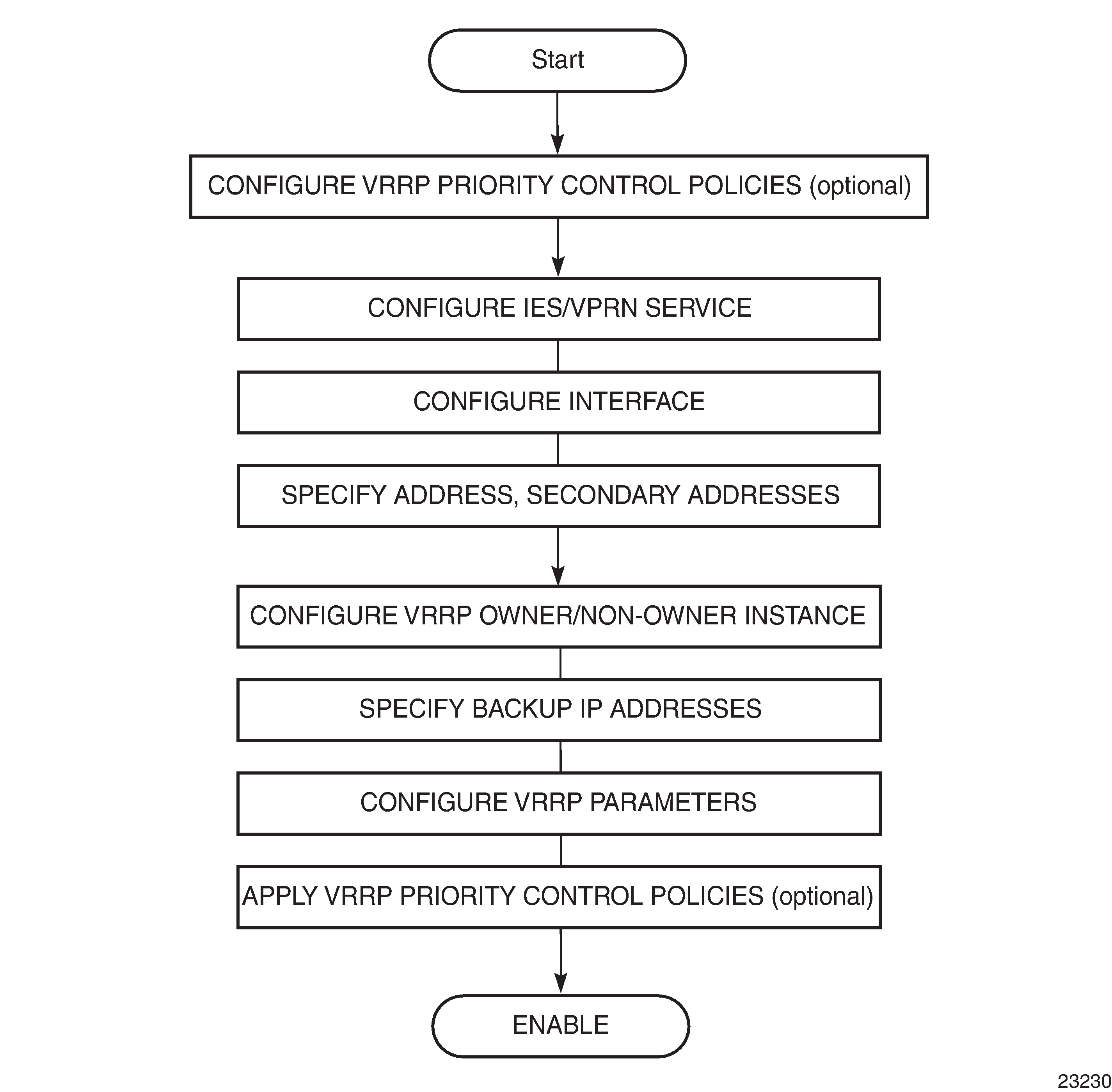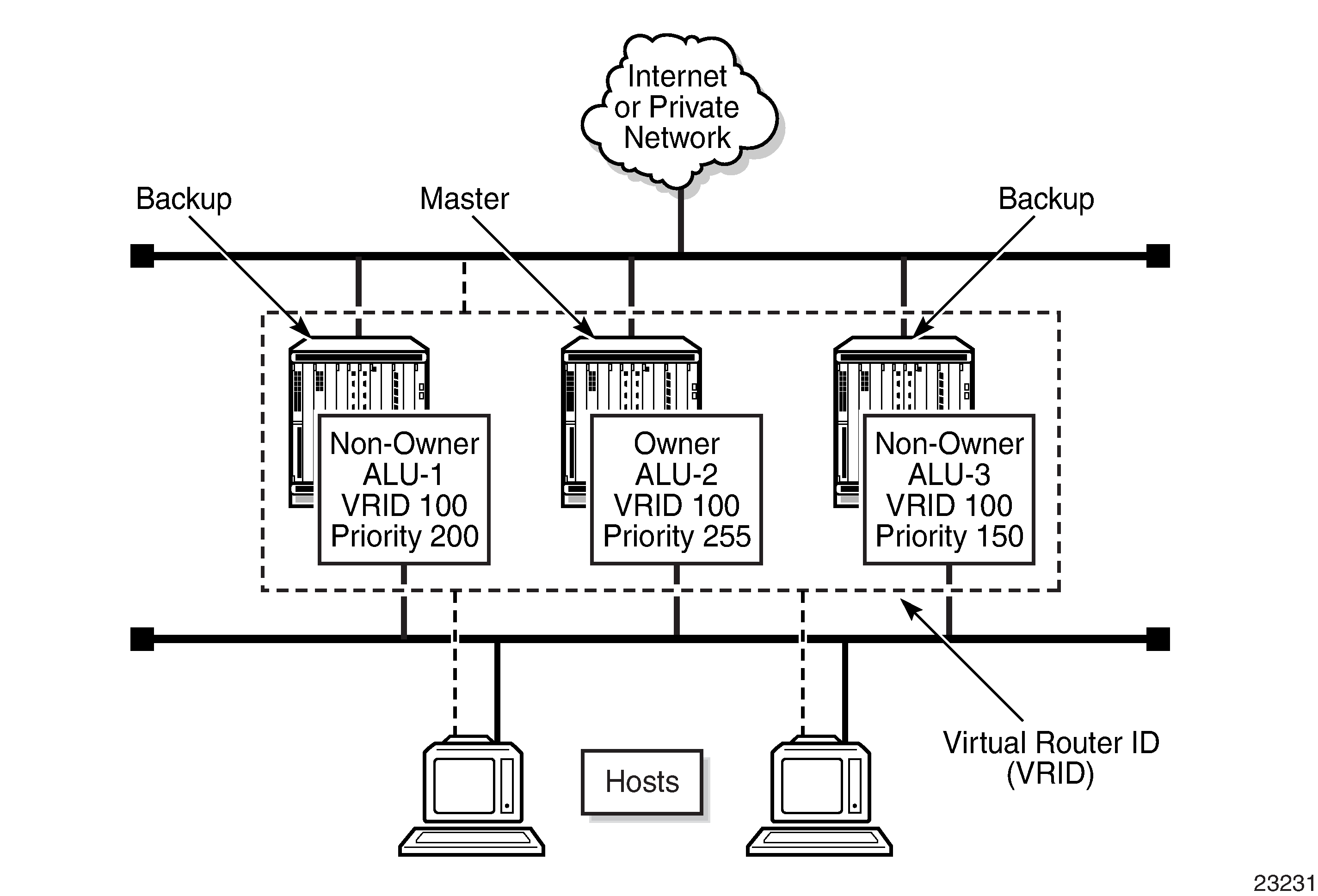 Virtual Router Redundancy Protocol (VRRP) is a method of implementing a redundant IP interface shared between two or more routers on a common LAN segment, allowing a group of routers to function as one virtual router. If the IP interface of the virtual router is specified as a default gateway on hosts directly attached to the LAN, the routers sharing the IP interface by participating in VRRP as part of the virtual router instance will prevent a single point of failure by ensuring access to this gateway address. VRRP can be implemented on IES and VPRN service interfaces. VRRPv3 can also be implemented on IES and VPRN service interfaces, including r-VPLS interfaces for both IES and VPRN.