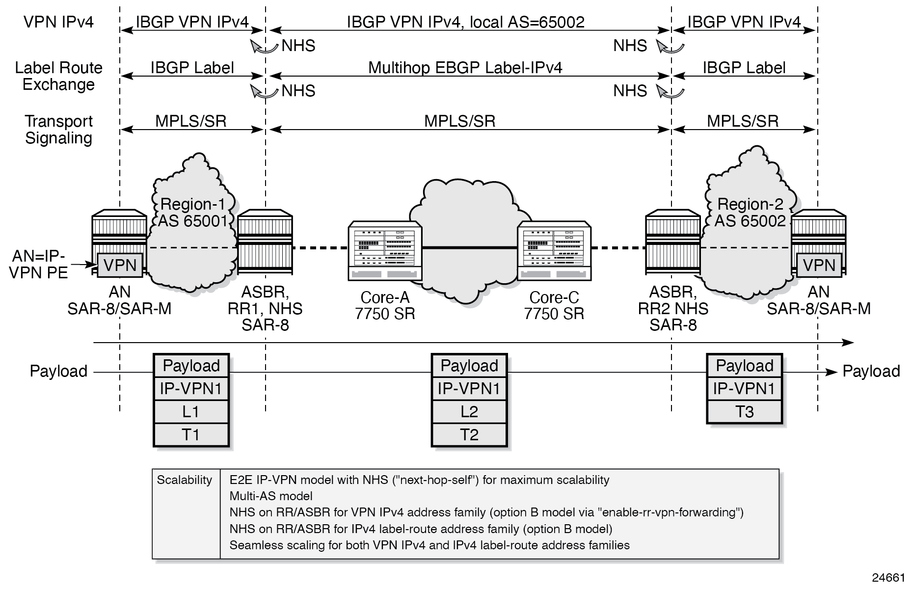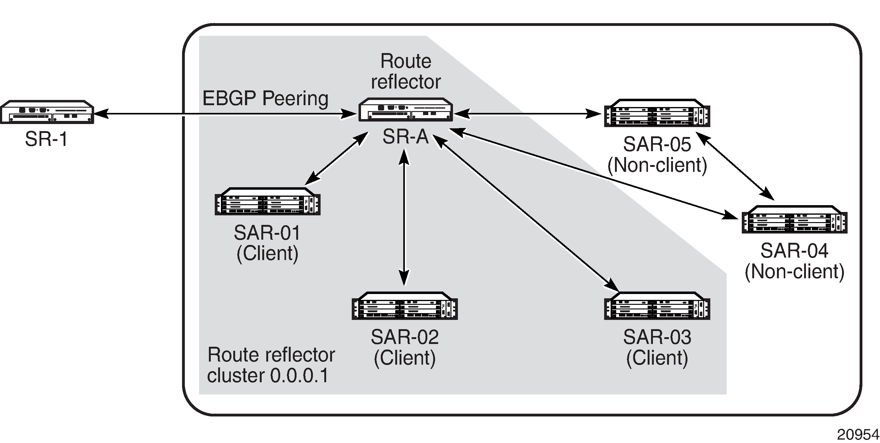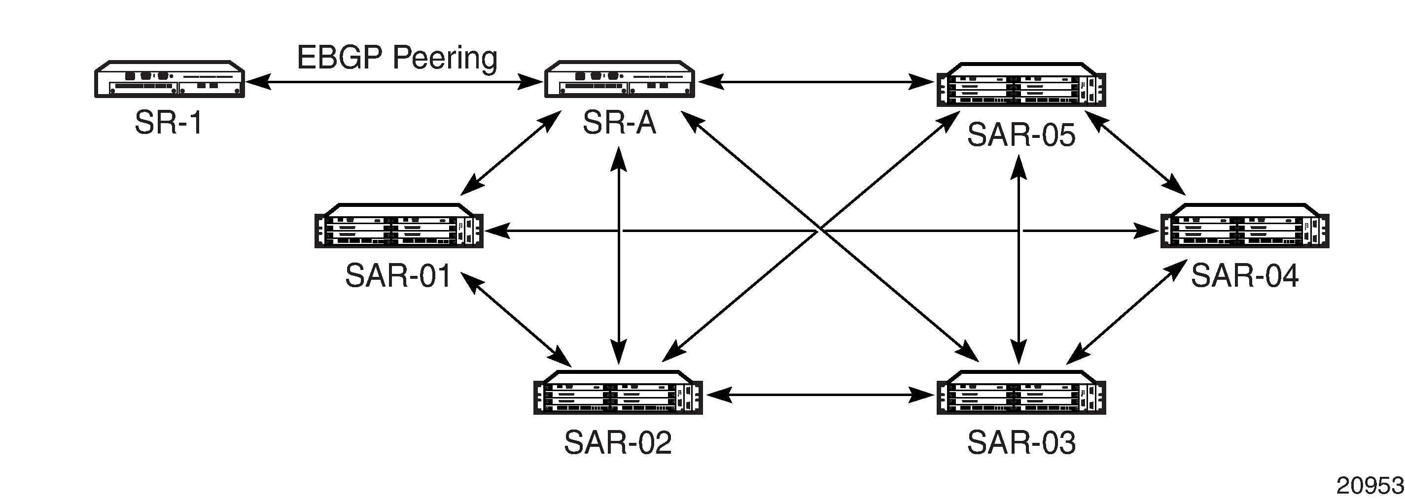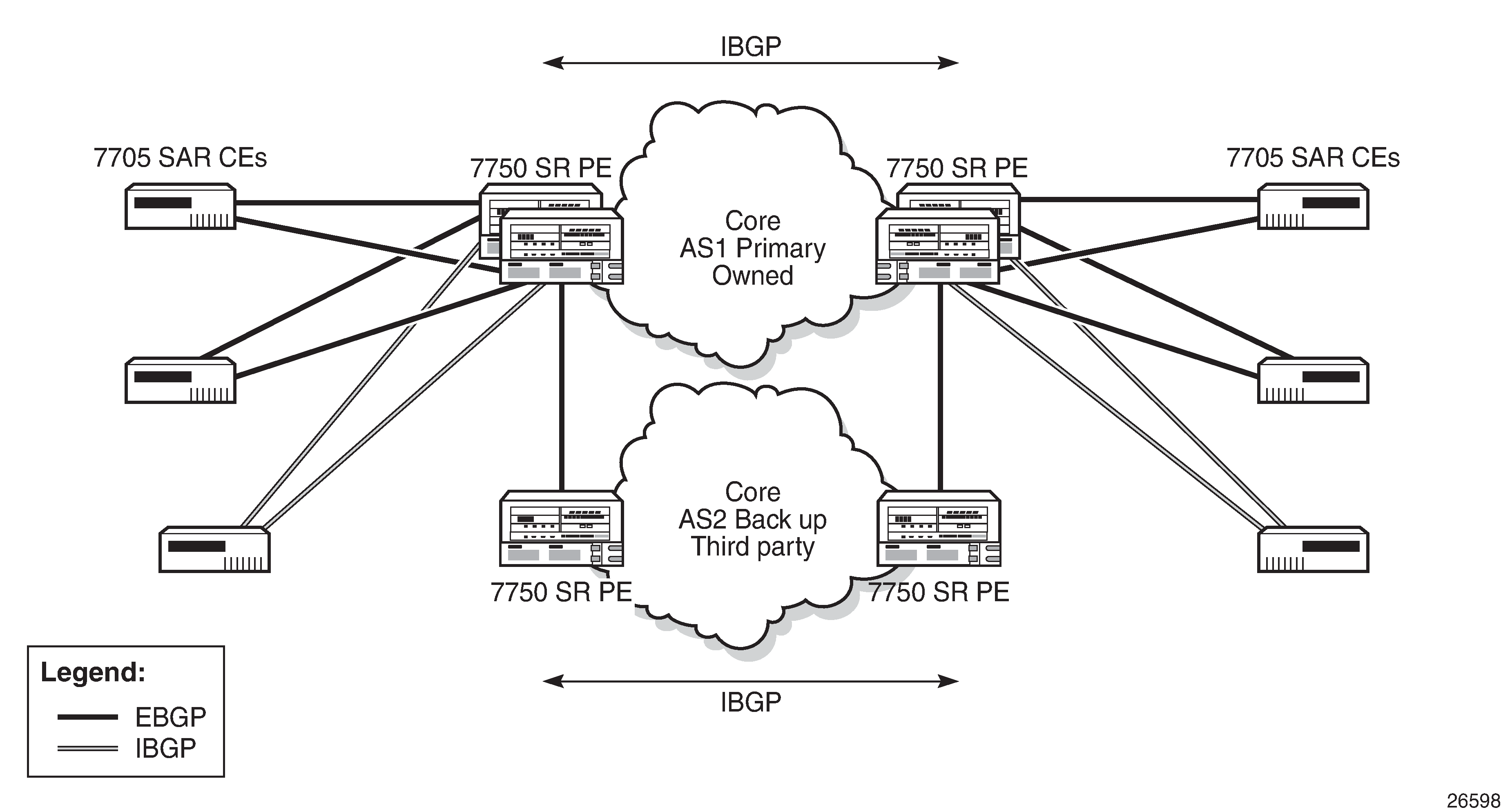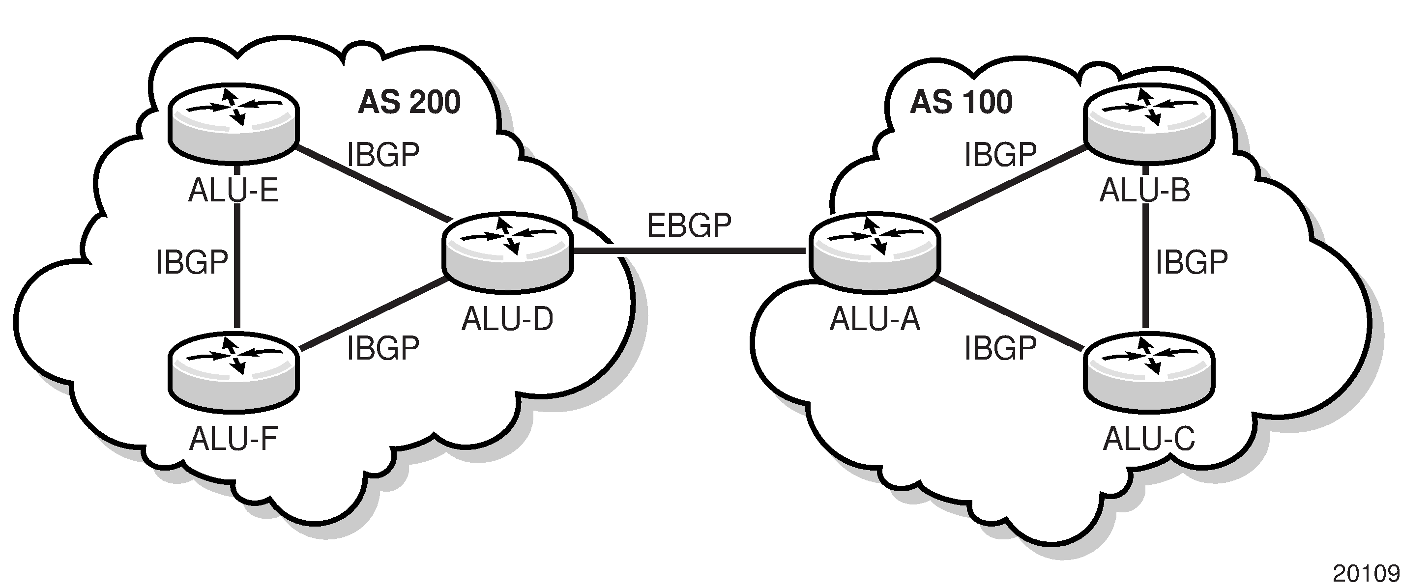 The 7705 SAR supports EBGP within the router context and VPRN context. For information about configuring EBGP within the VPRN context, see the 7705 SAR Services Guide, ‟VPRN Services”. IBGP is supported within a router context but not within a VPRN context.