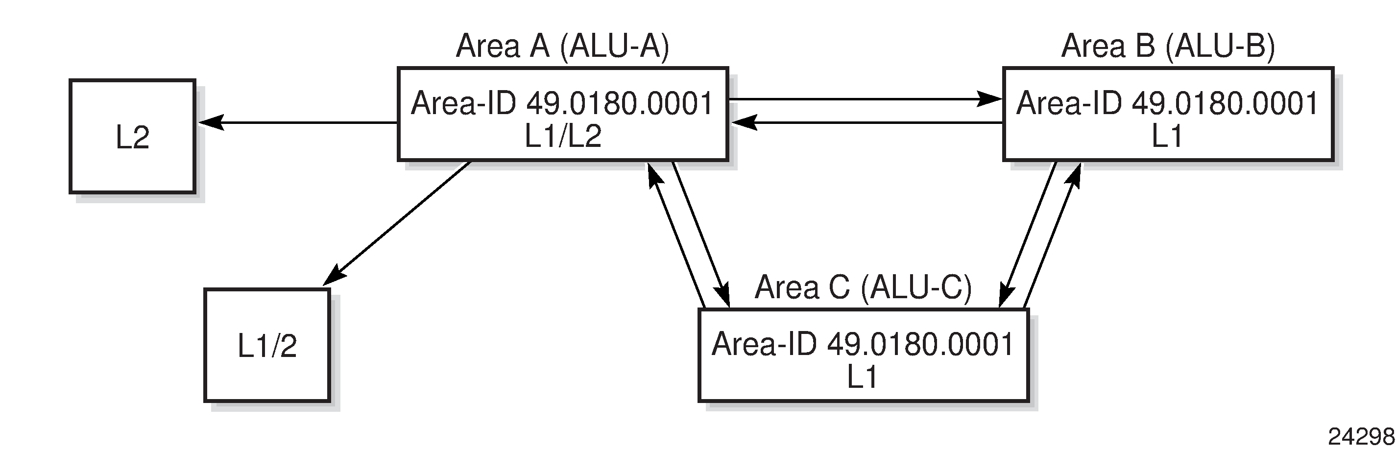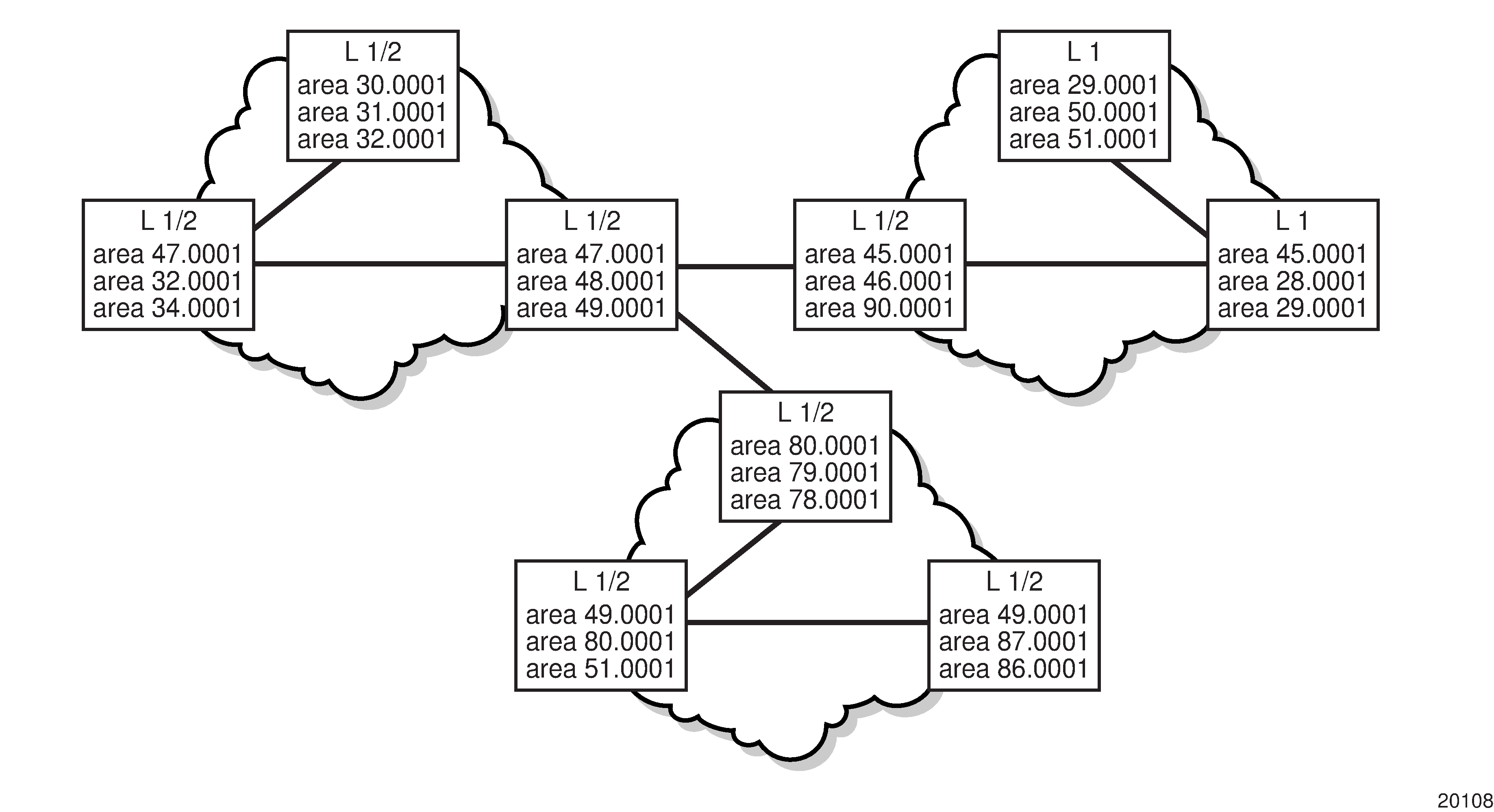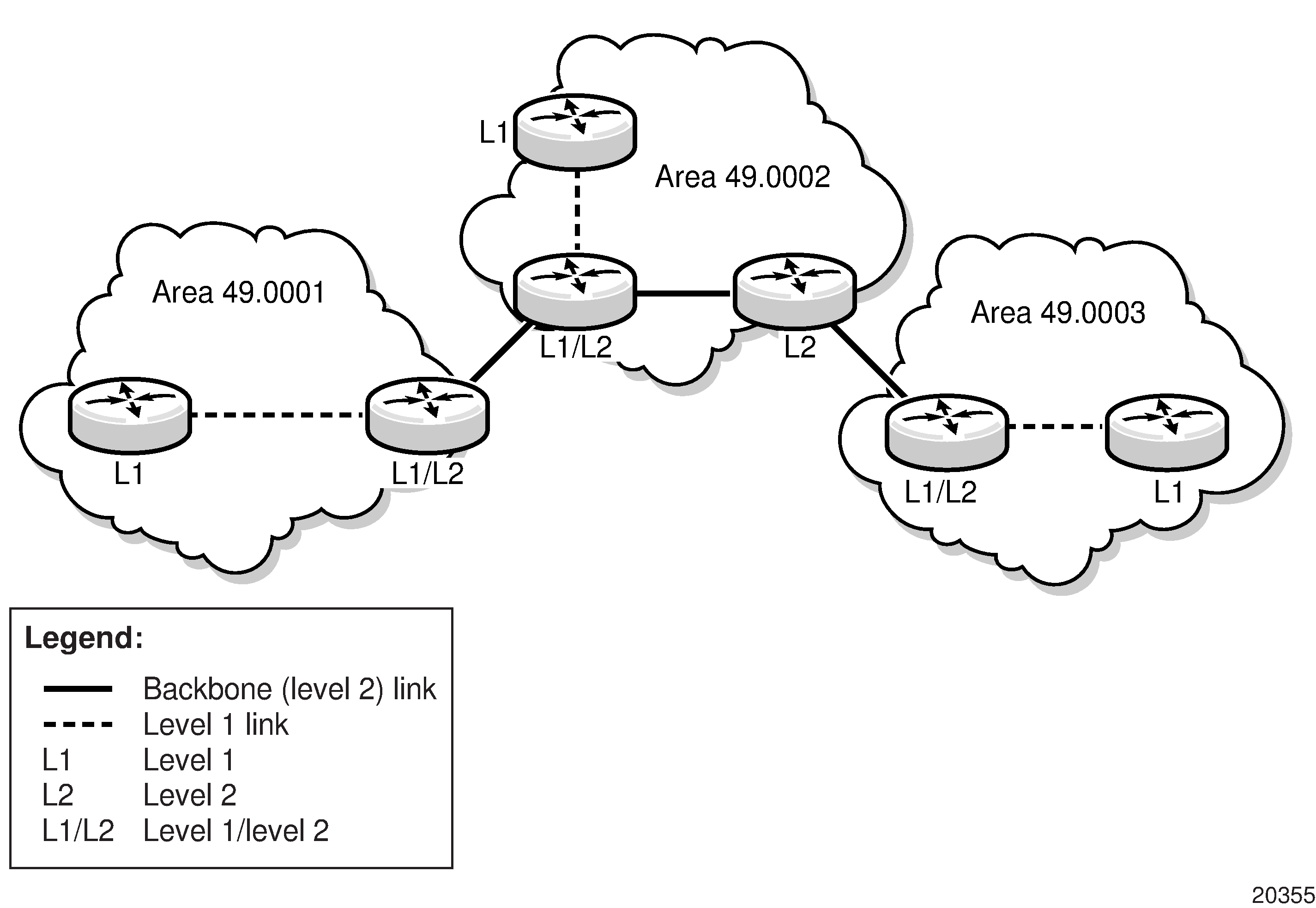 IS-IS uses a two-level hierarchy when dividing an AS into smaller areas. A system logically belongs to one area. Level 1 routing is performed within an area. Level 2 routing is performed between areas. The 7705 SAR can be configured as a level 1 router, level 2 router, or level 1/2 router. By default, the 7705 SAR is a level 1/2 router, which enables the router to operate as a level 1 and/or a level 2 router with the associated databases. The router runs separate shortest path first (SPF) calculations for the level 1 area routing and for the level 2 multi-area routing to create the IS-IS routing table for the IS-IS instance.