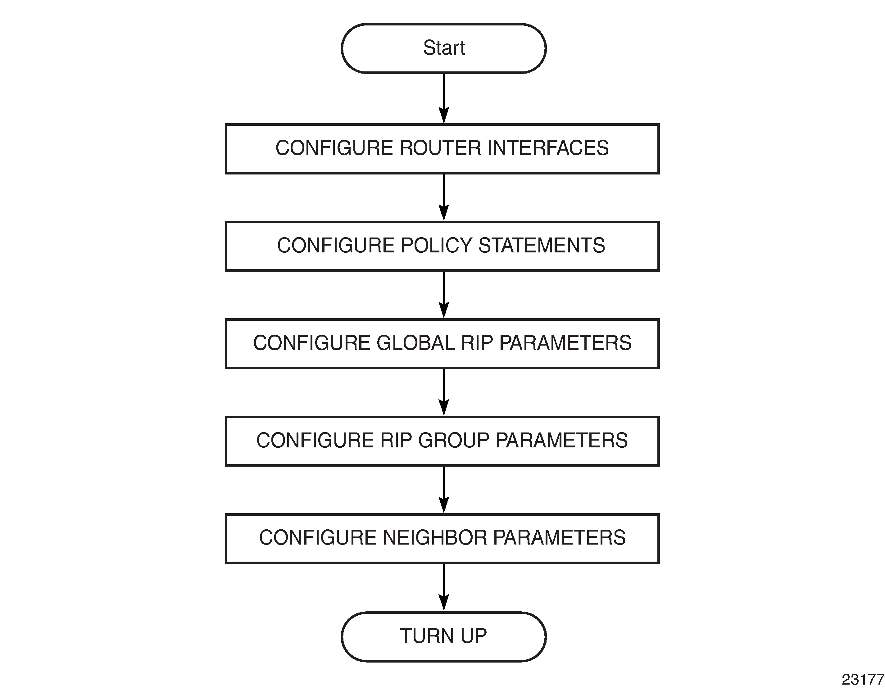 RIP is configured in the config>router>rip context for network interfaces and IES access interfaces. RIP is configured in the config>service>vprn>rip context for VPRN interfaces when RIP is used as a PE-to-CE routing protocol for VPRN service. For information about configuring RIP under VPRN, see the 7705 SAR Services Guide, ‟Configuring RIP for VPRN”.