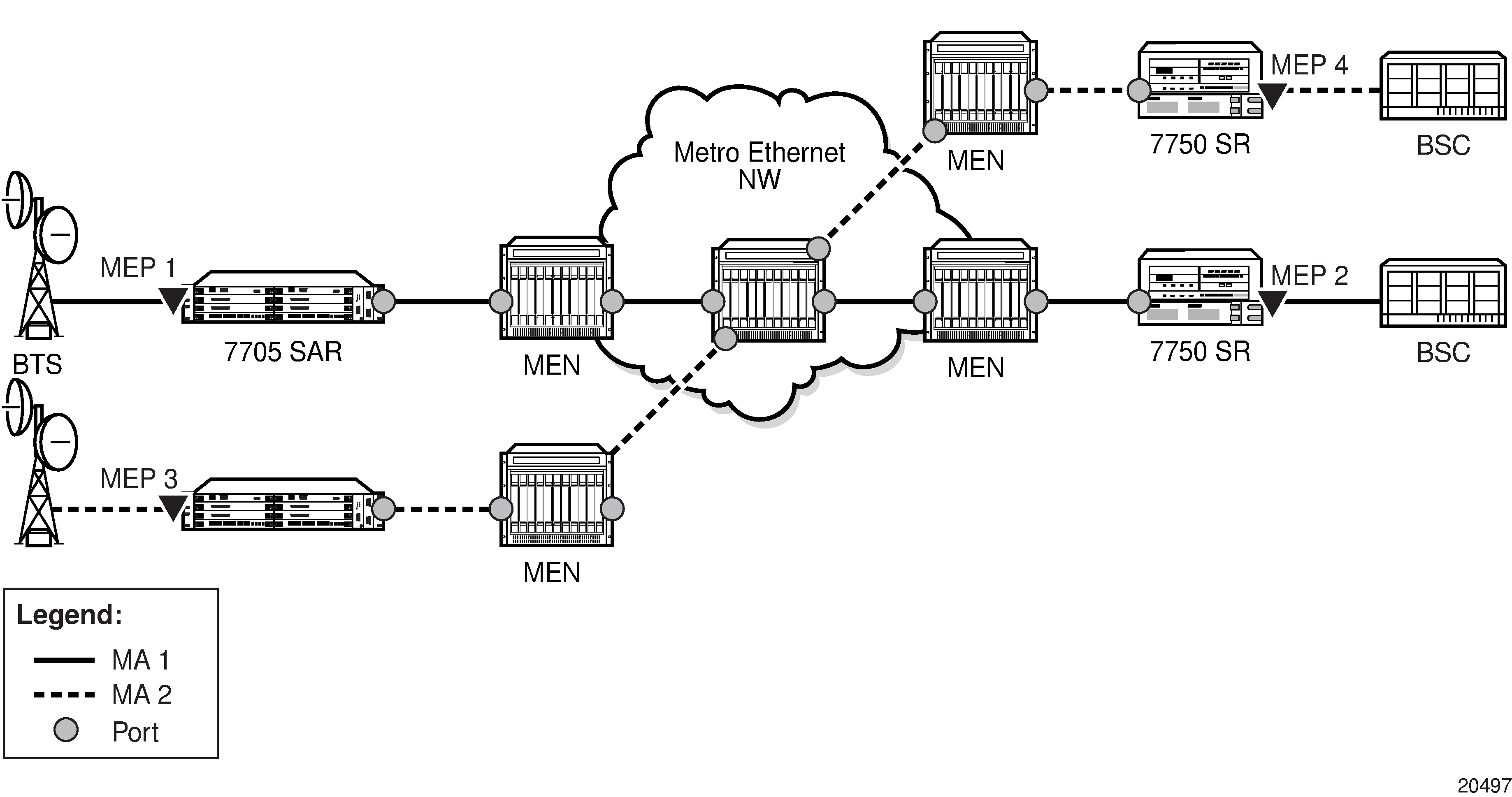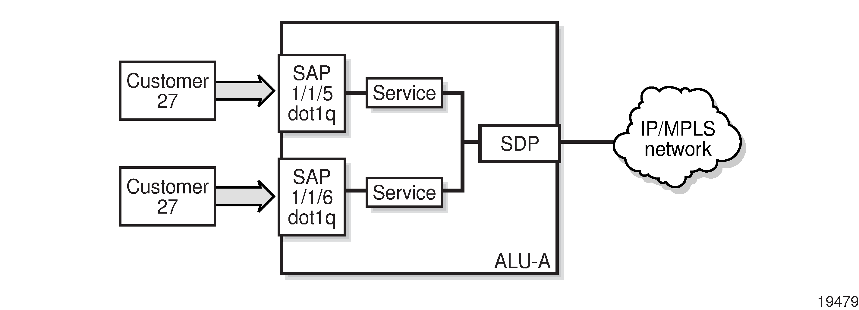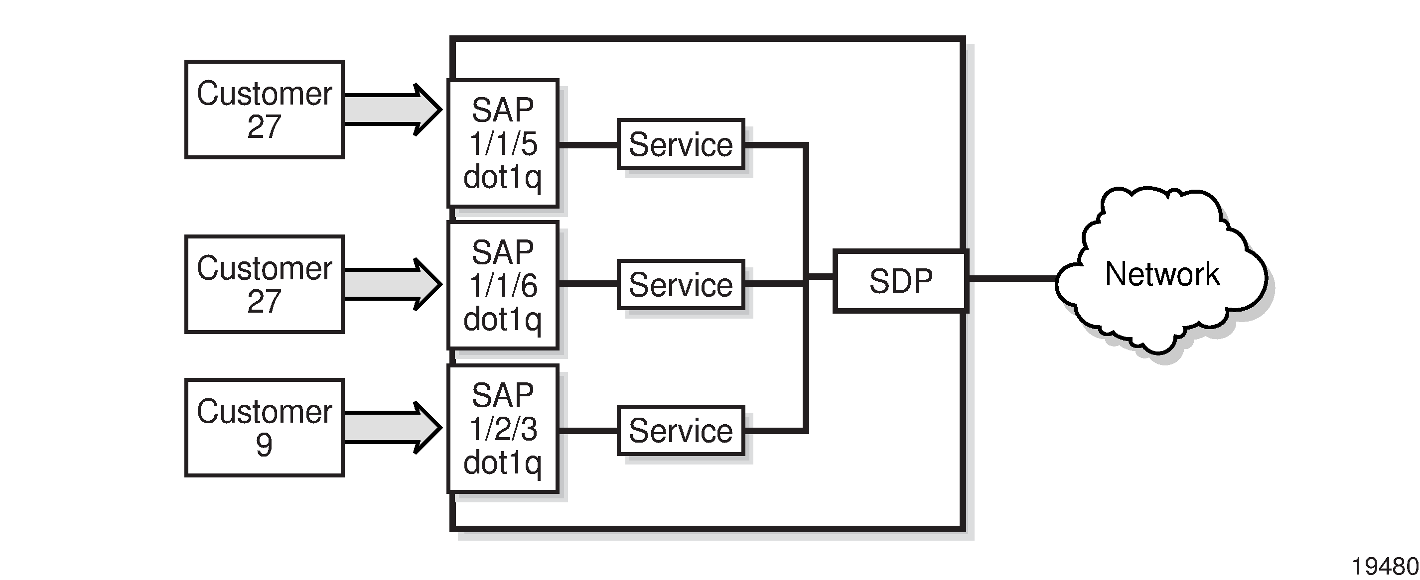The 7705 SAR service model uses (logical) service entities to construct a service. These logical entities provide a uniform, service-centric configuration, management, and billing model for service provisioning (see Nokia service model for more information). Many services can be created on the same 7705 SAR at the same time, and each service is uniquely identified by a service ID.