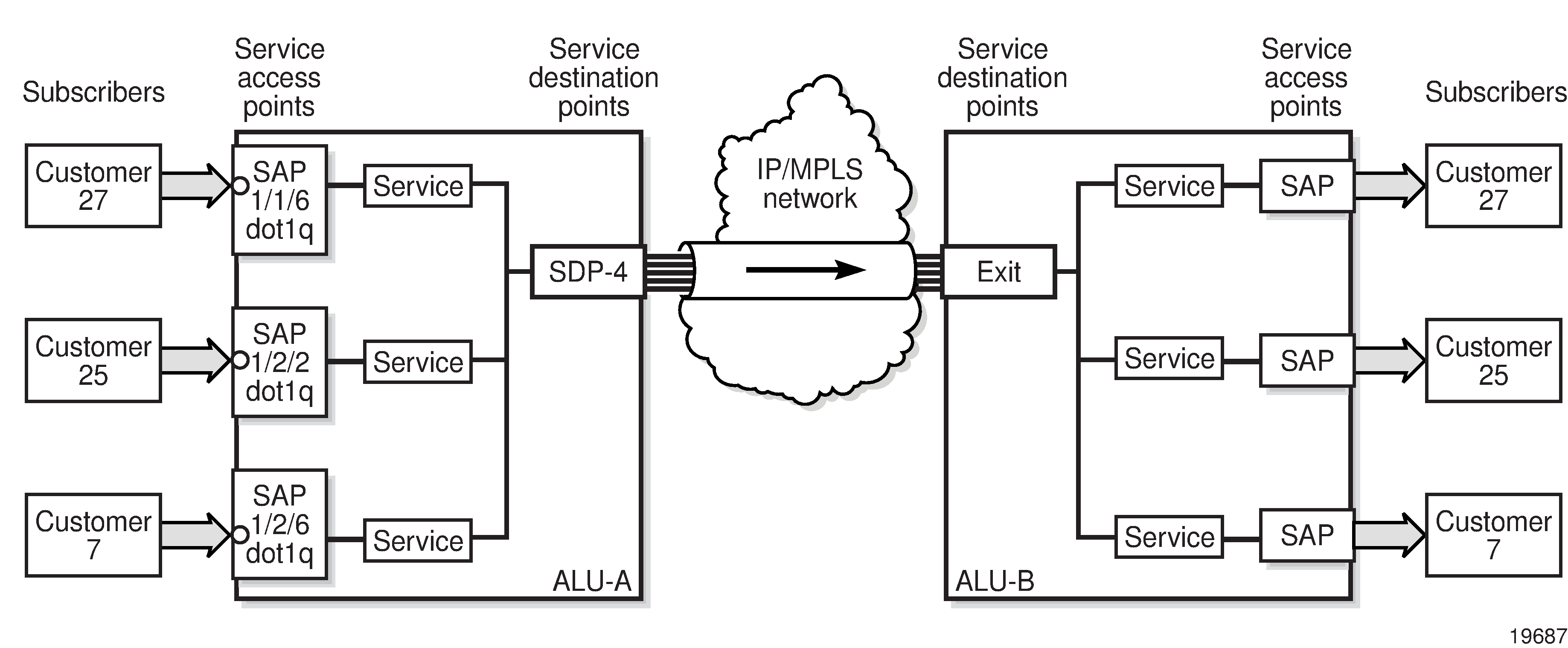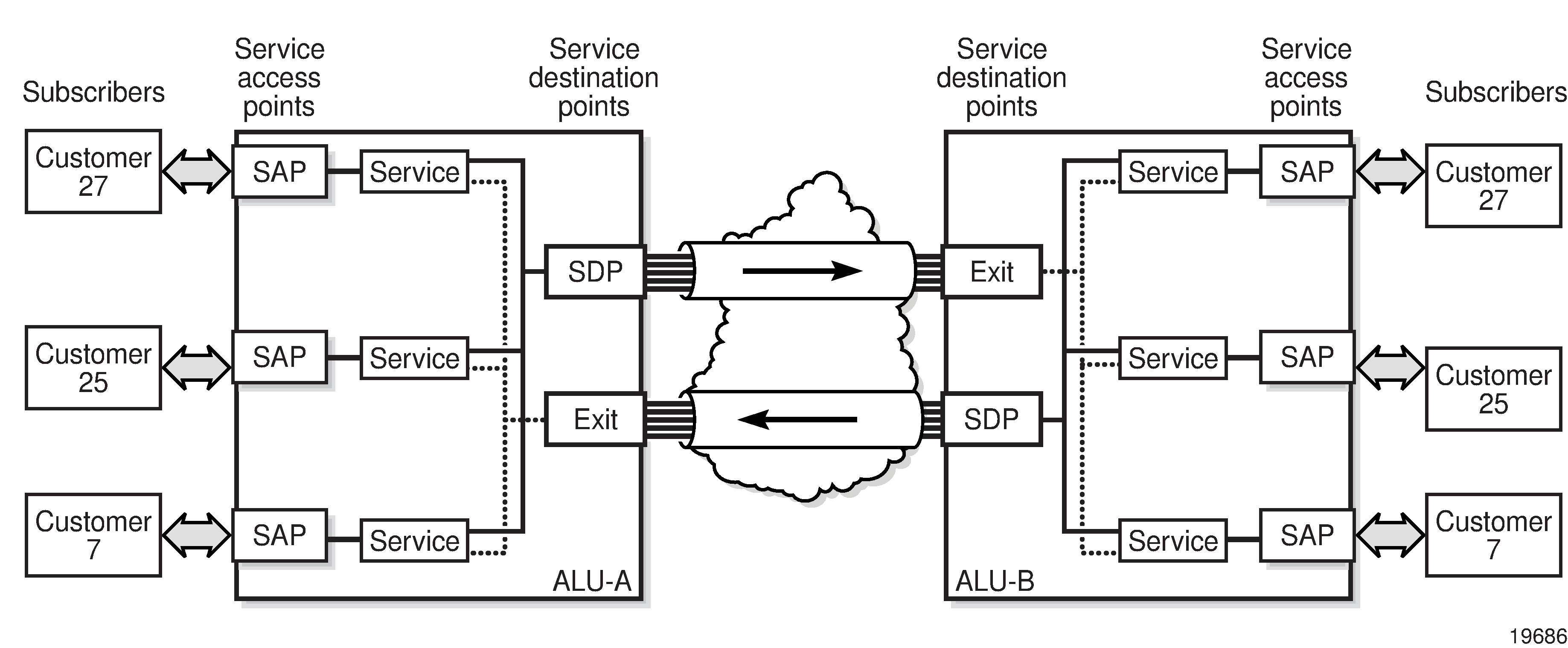 The following figure shows an example of how the service entities relate to the service model. A subscriber (or customer) attachment circuit connects to a SAP. SDPs define the entrance and exit points of unidirectional service tunnels, which carry one-way traffic between the two routers (ALU-A and ALU-B). After SDPs have been configured, they are bound to a service, which is the final step in making the end-to-end service connection. In the figure, the entrance point is labeled SDP and the exit point is labeled Exit.