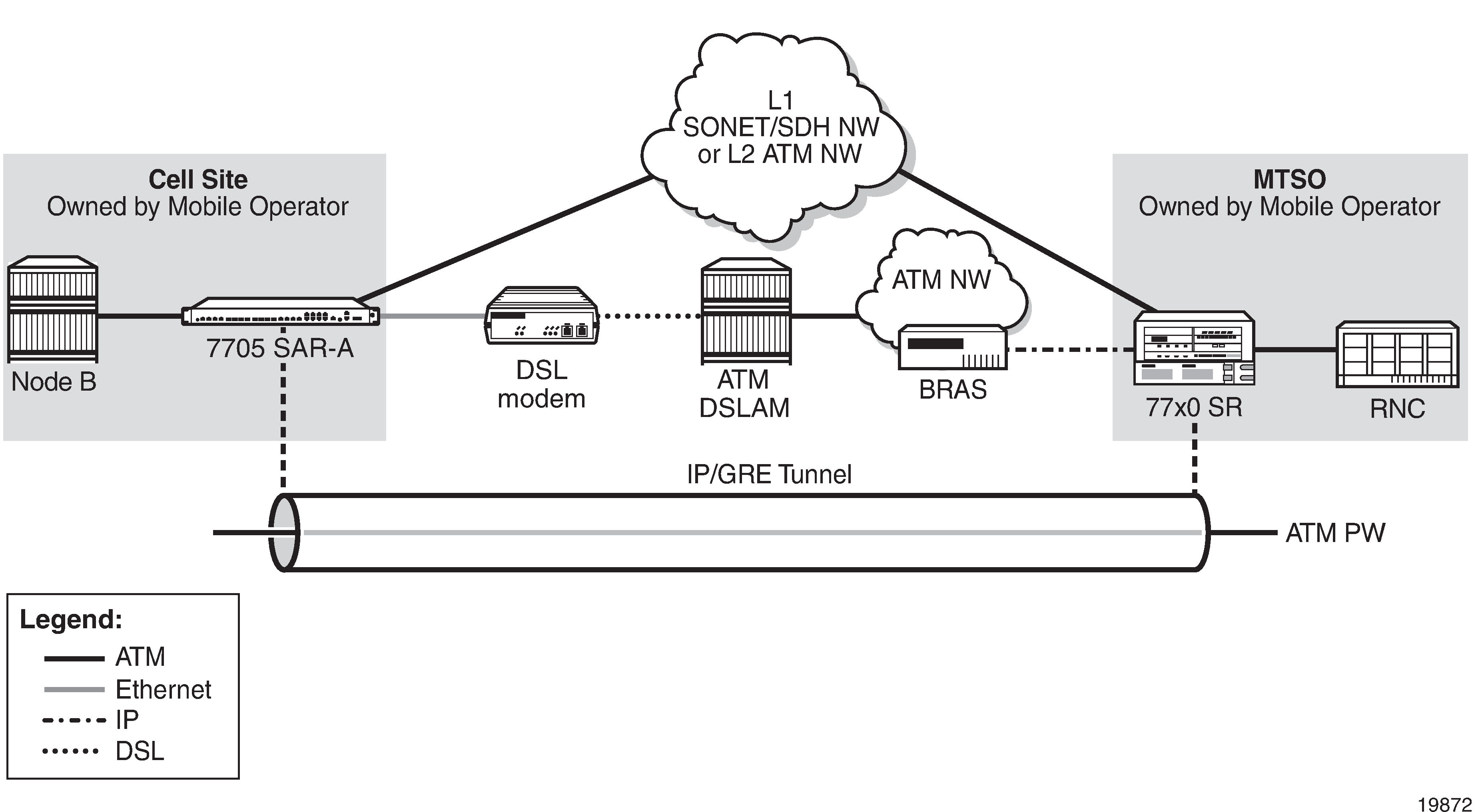 ATM VLL (Apipe) – a pseudowire emulation edge-to-edge (PWE3) ATM service over MPLS, GRE, or IP tunnels on 7705 SAR nodes. See ATM VLL (Apipe) services.