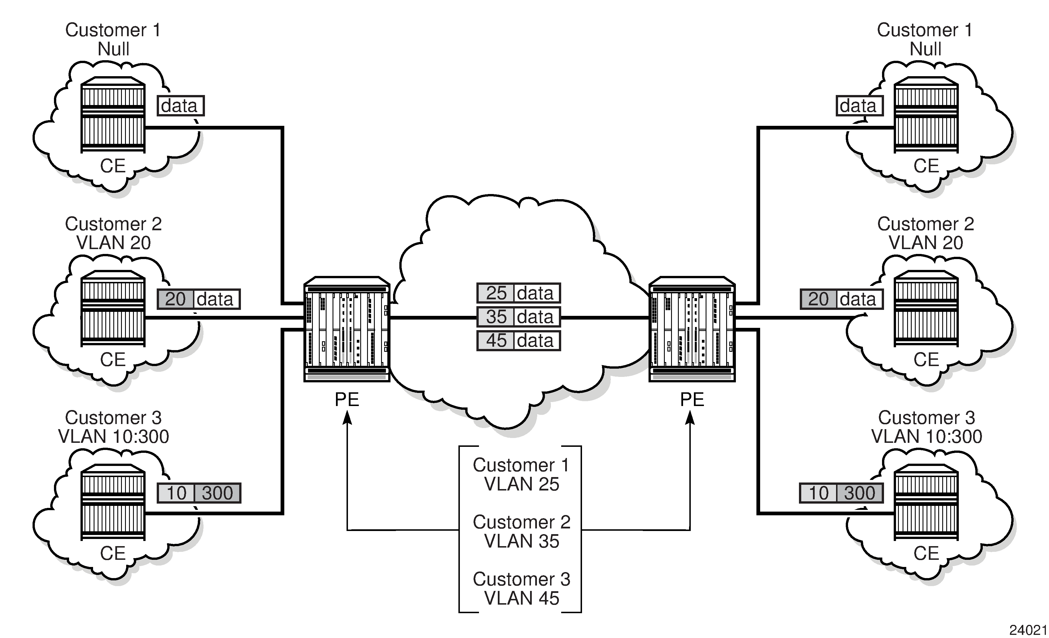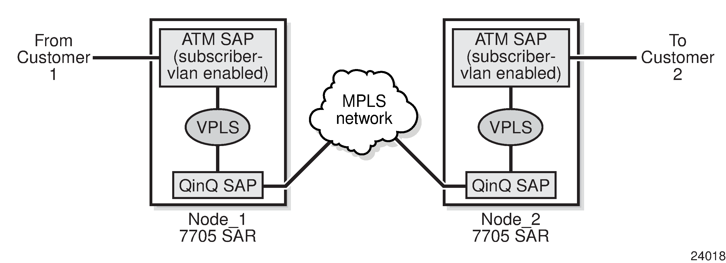 A virtual private LAN service (VPLS) enables Layer 2 multipoint connections within an enterprise infrastructure. Supported SAP encapsulations are null/dot1q/qinq Ethernet (on the 6-port Ethernet 10Gbps Adapter card, 7705 SAR-X, 8-port Gigabit Ethernet Adapter card, and the 10-port 1GigE/1-port 10GigE X-Adapter card) and ATM (on the 4-port OC3/STM1 Clear Channel Adapter card).