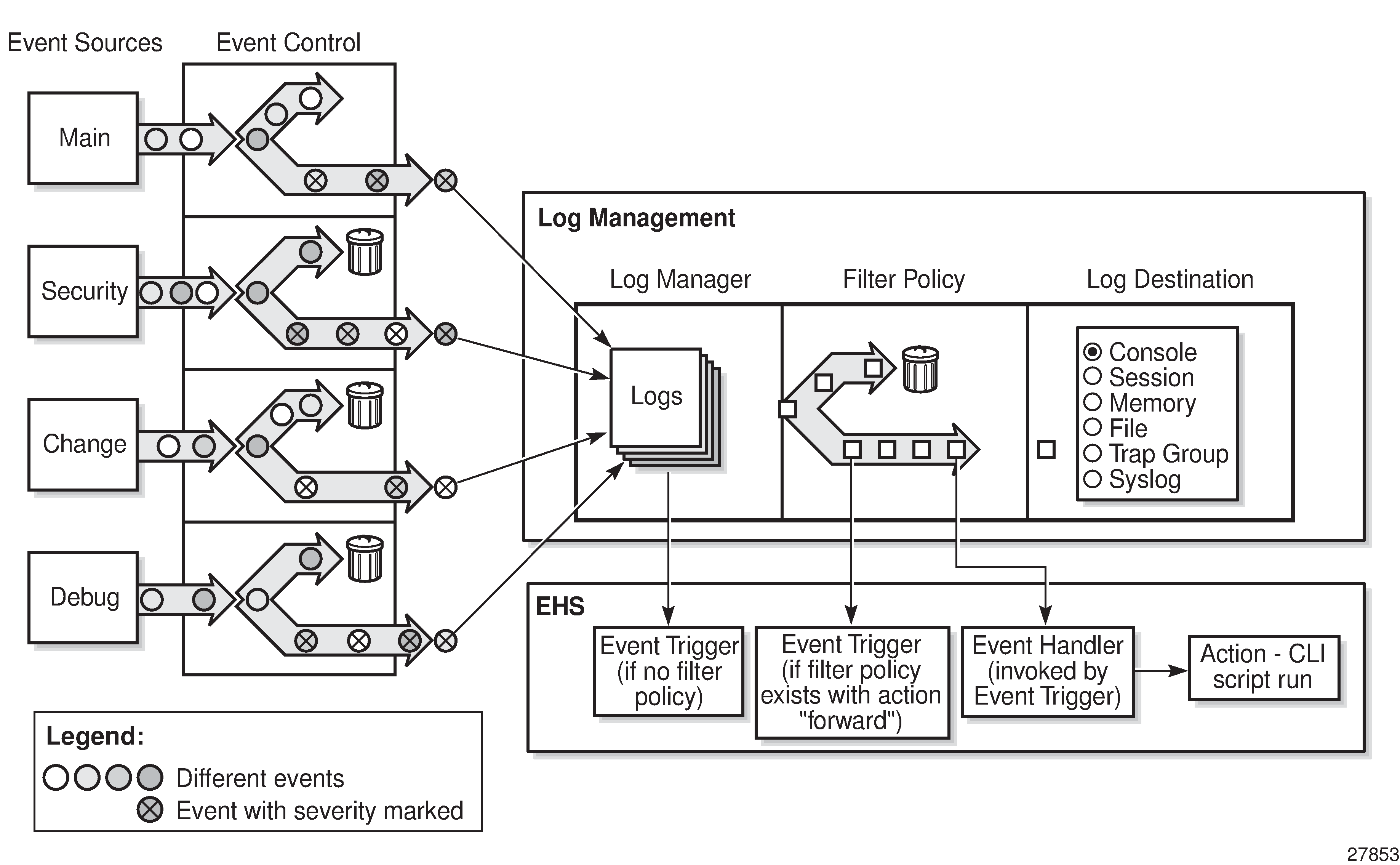 An event log within the 7705 SAR associates the event sources with logging destinations. Examples of logging destinations include the console session, memory logs, file destinations, SNMP trap groups, and syslog destinations. A log filter policy can be associated with the event log to control which events are logged in the event log based on combinations of application, severity, event ID range, and the subject of the event.
