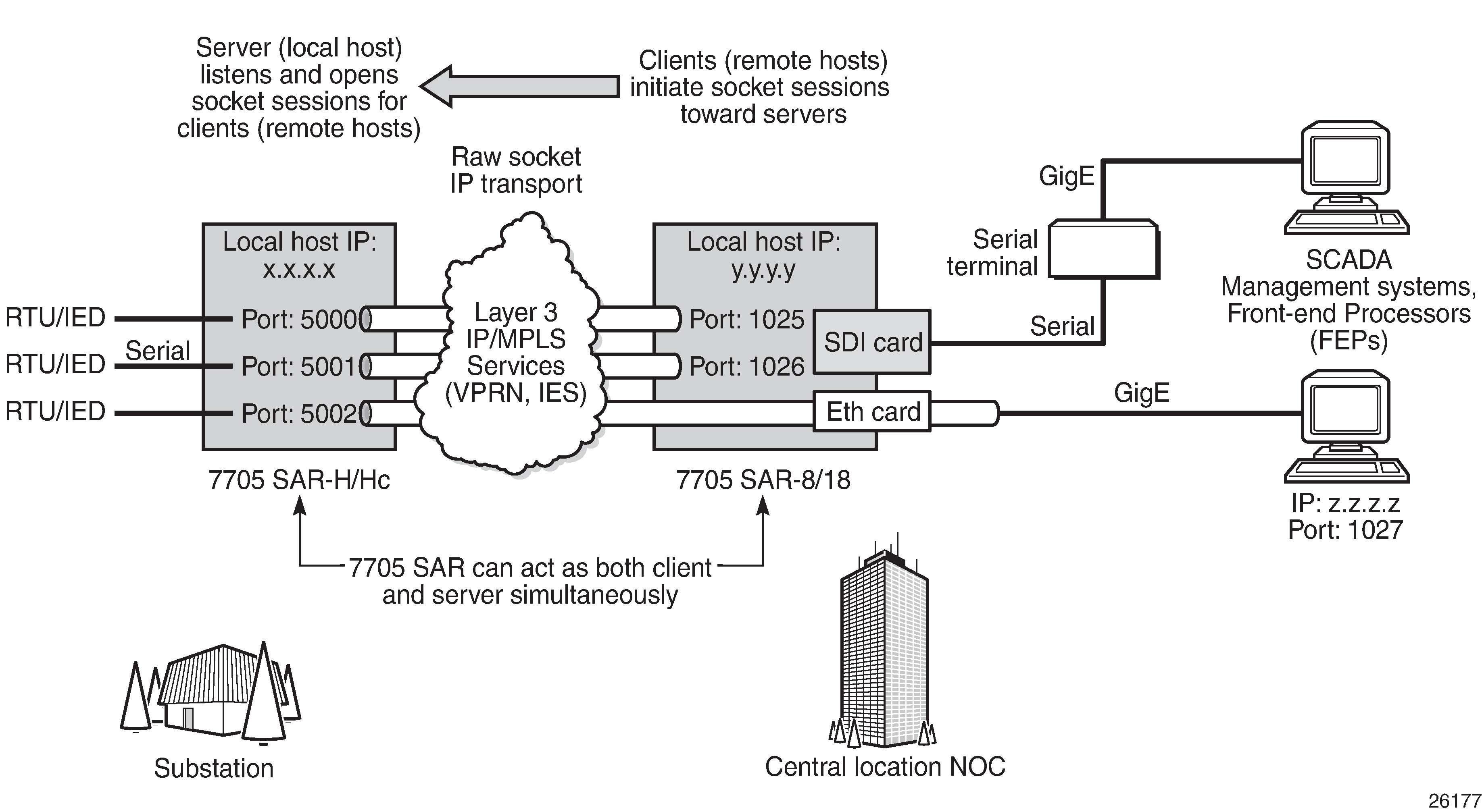 A raw socket local host (acting as a server) at the 7705 SAR-H/SAR-Hc substation listens to TCP sessions that originate at the 7705 SAR-8 Shelf V2/SAR-18 central location network operations center (NOC). The 7705 SAR-8 Shelf V2/SAR-18 at the NOC is connected to two front-end processors (FEPs), one via a serial port and another via an Ethernet port. The serial port on the 7705 SAR-8 Shelf V2/SAR-18 is configured as a remote host (acting as a client) that initiates TCP/UDP sessions toward the RTU at the 7705 SAR-H/SAR-Hc substation when traffic is received from the FEP over the serial port. These TCP/UDP sessions are transported over the IP/MPLS network using IP transport service over an IES or VPRN service. The serial data that is transported over the TCP/UDP session and received at the 7705 SAR-H/SAR-Hc is then sent over the serial link toward the RTU. TCP/UDP sessions received from the FEP over the Ethernet port are transported over an IES or VPRN service (that is, there is no need for serial remote host configuration in this case).