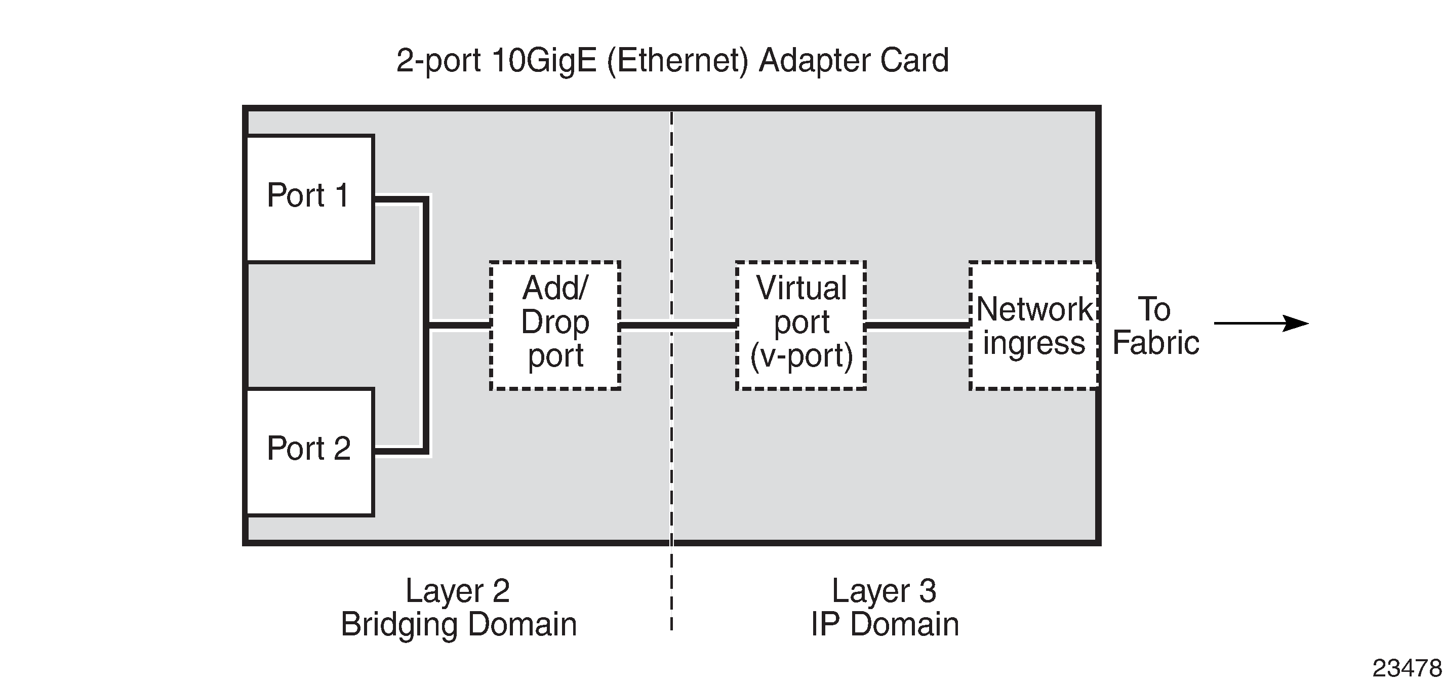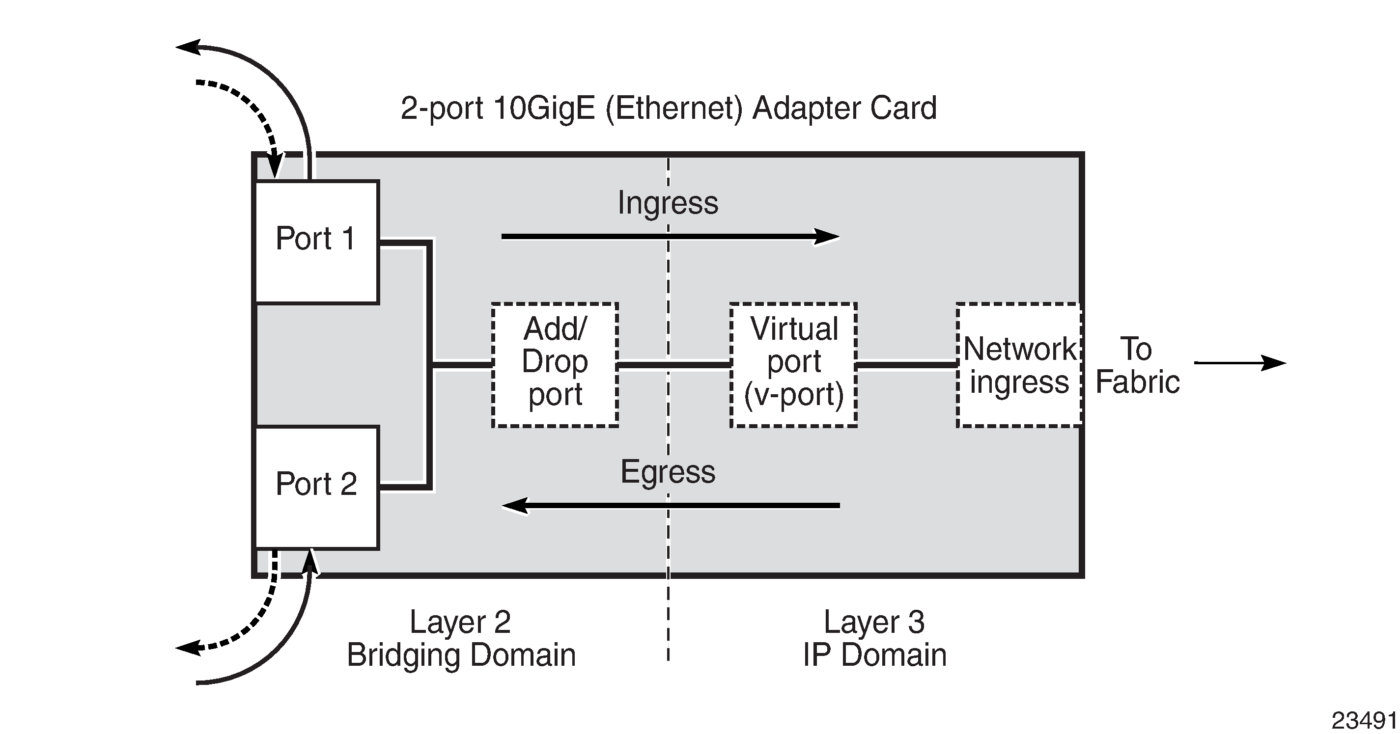 On the 2-port 10GigE (Ethernet) Adapter card and 2-port 10GigE (Ethernet) module, traffic can flow between the Layer 2 bridging domain and the Layer 3 IP domain (see Ingress and egress traffic on a 2-port 10GigE (Ethernet) Adapter card). In the bridging domain, ring traffic flows from one ring port to another, as well as to and from the add/drop port. From the network point of view, traffic from the ring toward the add/drop port and the v-port is considered ingress traffic (drop traffic). Similarly, traffic from the fabric toward the v-port and the add/drop port is considered egress traffic (add traffic).