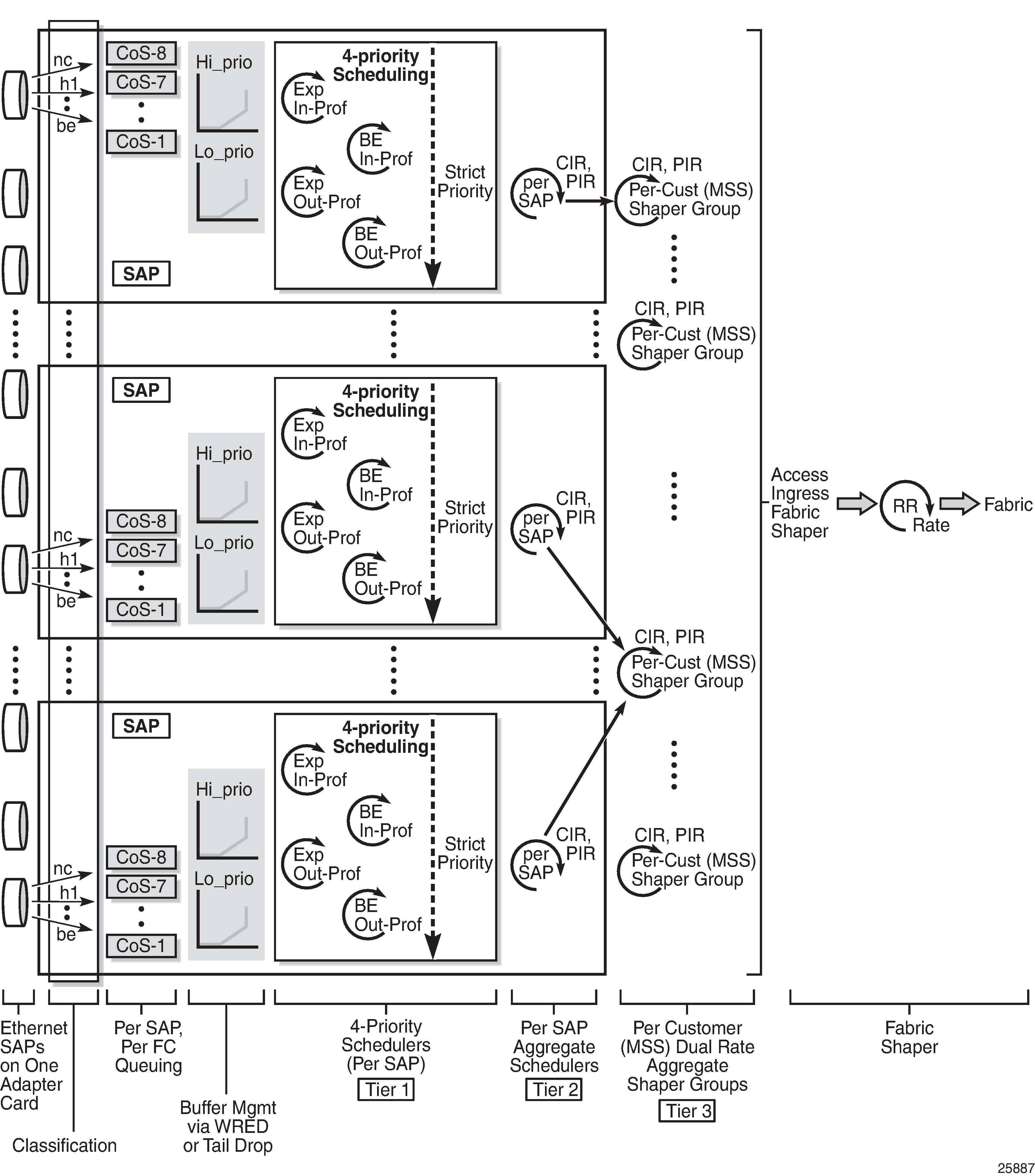 See Per-SAP aggregate shapers (H-QoS) on Gen-2 hardware and Per-VLAN network egress shapers for details on per-SAP and per-VLAN shapers.