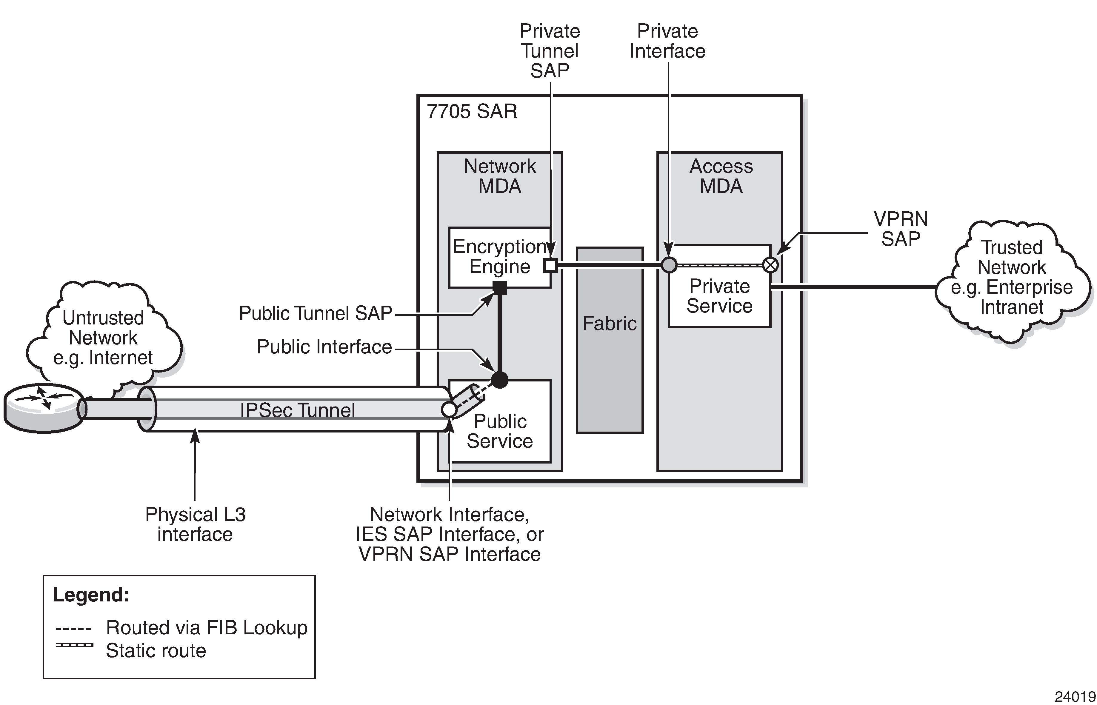 For IPSec, the 7705 SAR supports VPRN for the private side of the tunnel and IES or VPRN for the public side of the tunnel. In the following figure, a public service instance (IES, VPRN, or network) connects to the public network and a private service instance (VPRN) connects to the private network, which originates the traffic that is to be encrypted.