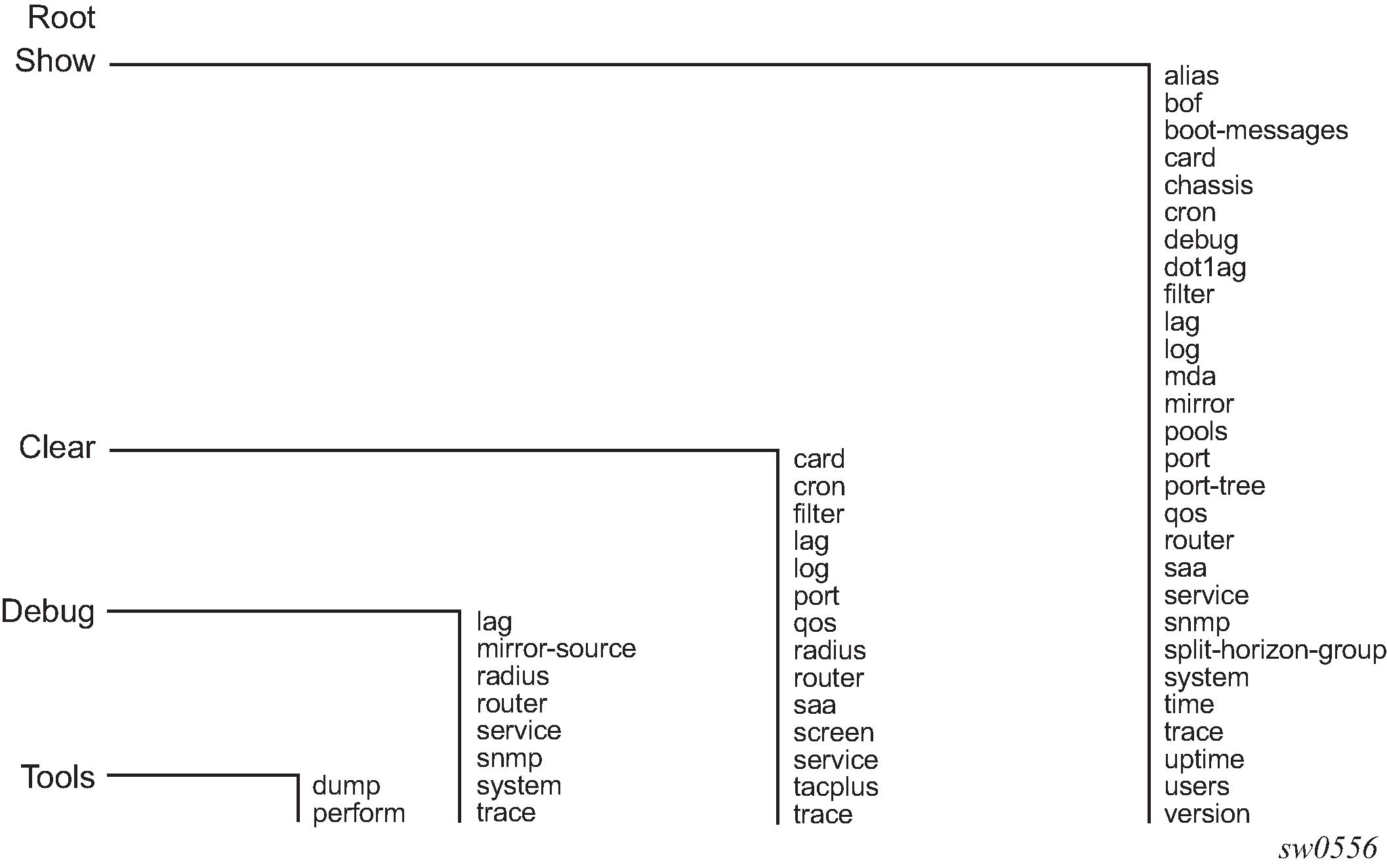 The CLI command tree is a hierarchical inverted tree. At the highest level is the ROOT level. Below this level are other tree levels with the major command groups; for example, configuration commands and show commands are levels below ROOT.