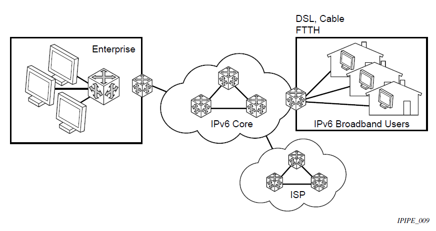 The following figure shows IPv6 connectivity to enterprise and home broadband users.