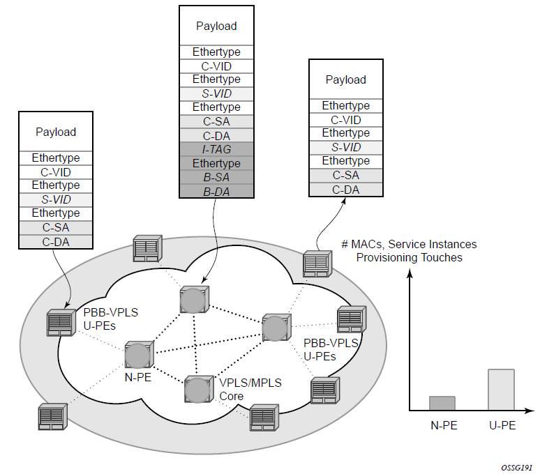 PBB adds a regular Ethernet header where the B-DA and B-SA are the backbone destination and respectively, source MACs of the edge U-PEs. The backbone MACs (B-MACs) are used by the core N-PE devices to switch the frame through the backbone.