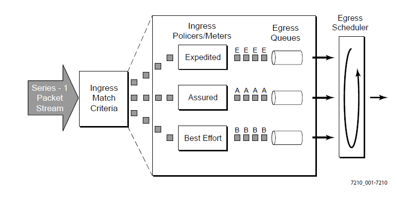 The 7210 SAS devices are designed with ingress and egress QoS mechanisms to support multiple services per physical port. The 7210 SAS devices are extensive and flexible capabilities to classify, police, queue, shape, and mark traffic.