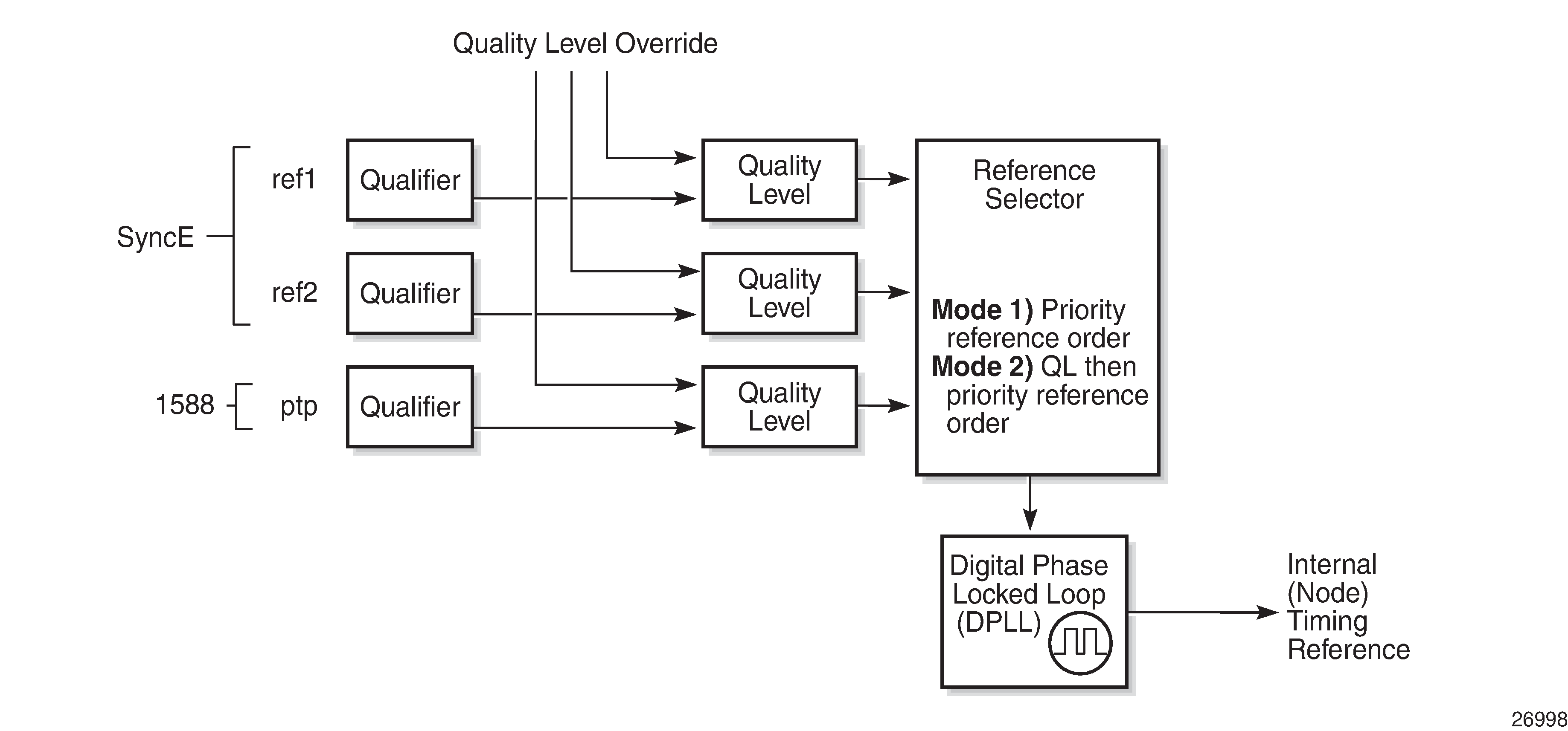 When the debug force-reference command is executed, the current system synchronous timing output is immediately referenced from the specified reference input. If the specified input is not available (shutdown), or in a disqualified state, the timing output enters the holdover state based on the previous input reference.