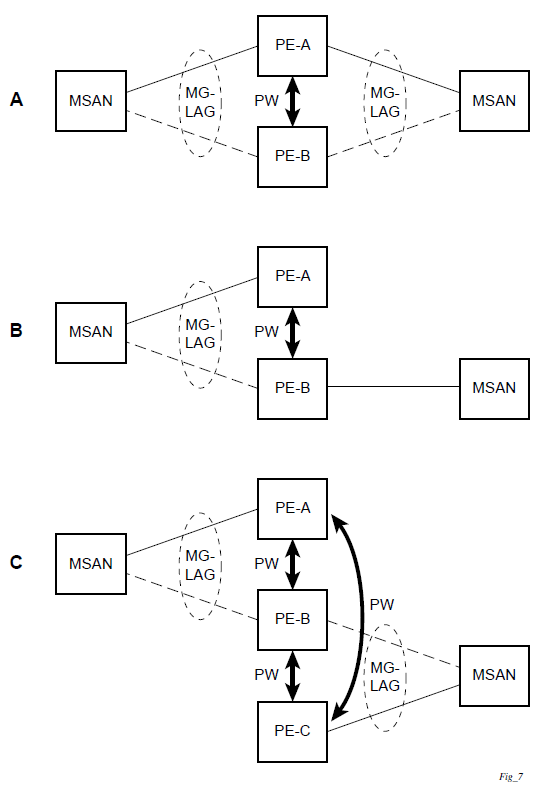 Note that the configuration in the following figure shows an example configuration of VLL connections based on MC-LAG. Specifically, it shows a VLL connection where the two ends (SAPs) are located on two different redundant-pairs. However, additional configurations are possible, for example: