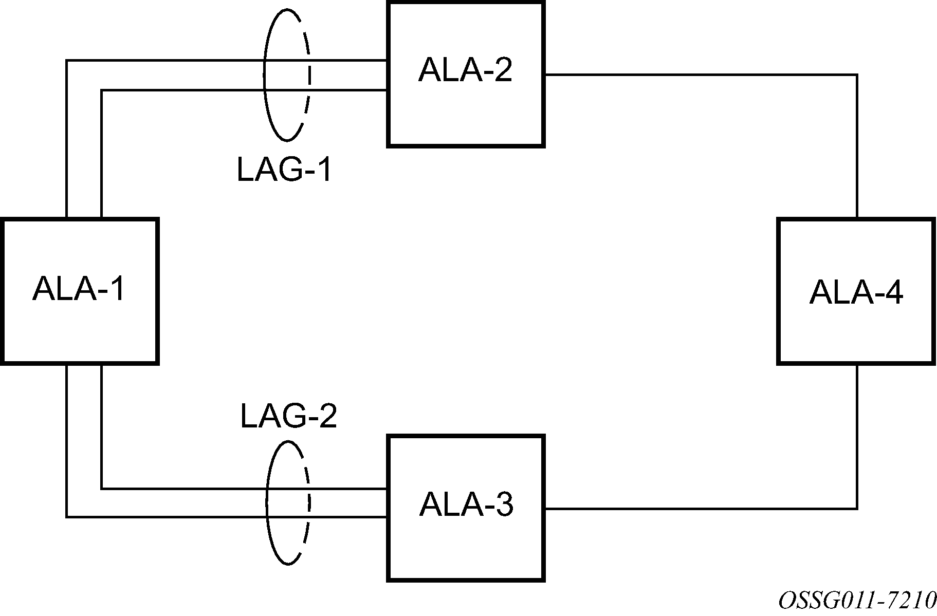 The following figure shows traffic routed between ALA-1 and ALA-2 as a LAG consisting of four ports.
