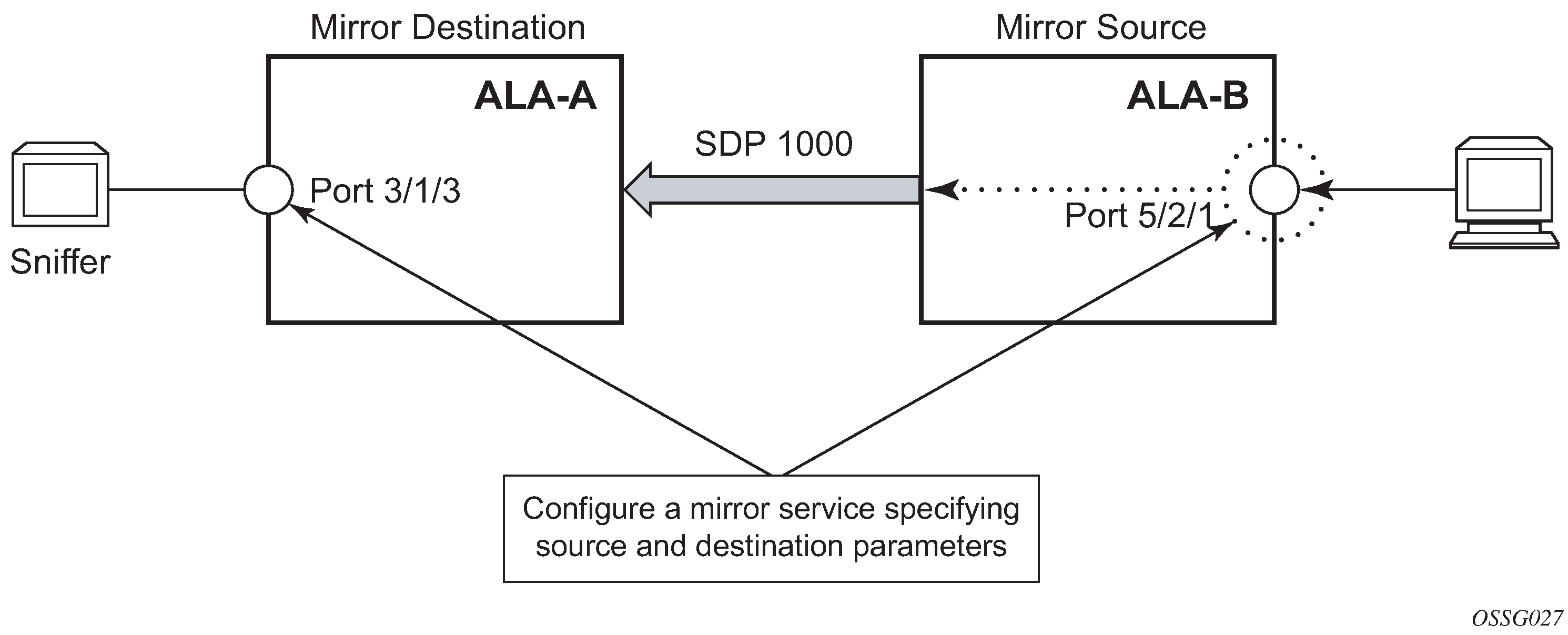 Destination parameters are defined to specify where the mirrored traffic is sent. In this case, mirrored traffic sent to a SAP configured as part of the mirror service on port 3/1/3 on ALA-A (the mirror destination).