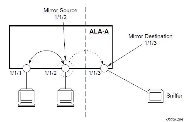 Port 1/1/2 is specified as the source. Mirrored traffic ingressing and egressing this port will be sent to port 1/1/3.