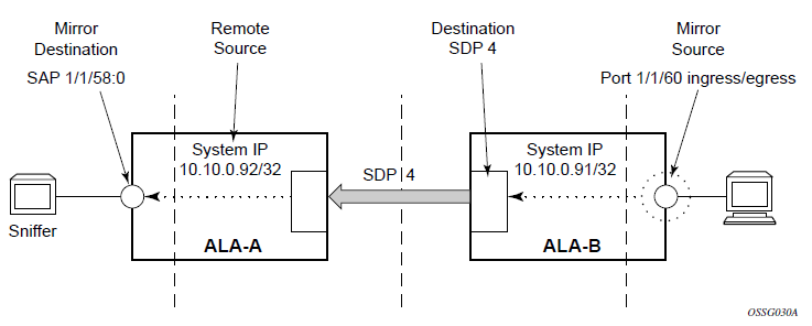 Mirroring can be configured for ingress or egress on specific service entities (for example: SAPs, ports, filter entries), which are referred to as mirror sources. A mirror copy of the packet is sent out of the mirror destination, which can be either a local mirror destination or remote mirror destination. For platform-specific support information about mirror sources and mirror destinations, see Mirror sources and destinations.