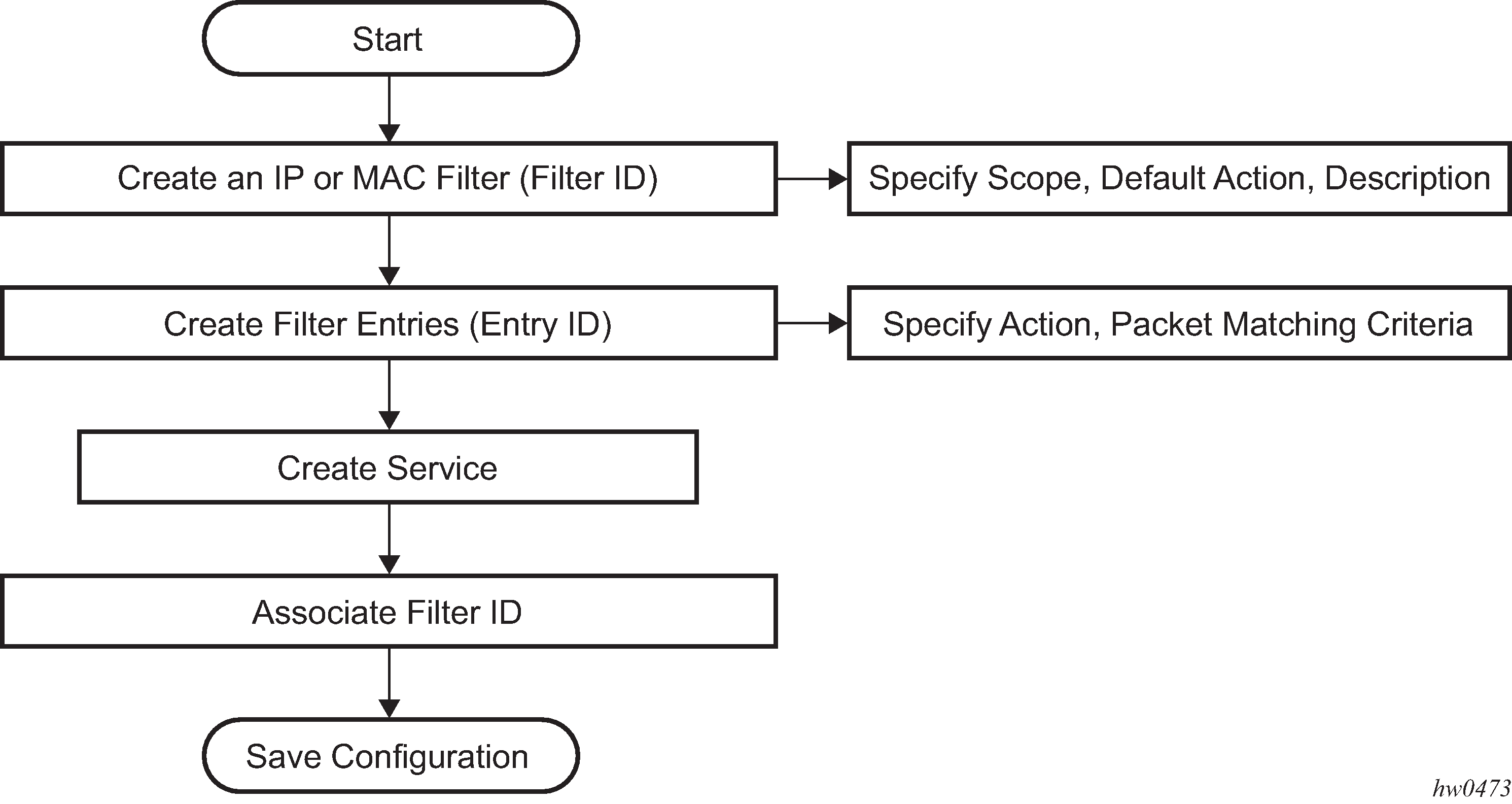Configuring an entity with a filter policy is optional. If an entity such as a service is not configured with filter policies, then all traffic is allowed on the ingress and egress interfaces. By default, there are no filters associated with services or interfaces. They must be explicitly created and associated. When you create a new filter, default values are provided although you must specify a unique filter ID value to each new filter policy as well as each new filter entry and associated actions. The filter entries specify the filter matching criteria and also an action to be taken upon a match.