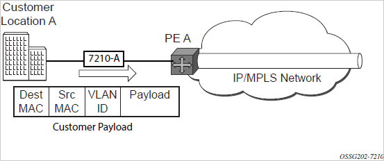 Service packets arriving at 7210-A are associated with a VPLS service instance based on the combination of the physical port and the IEEE 802.1Q tag (VLAN-ID) in the packet.