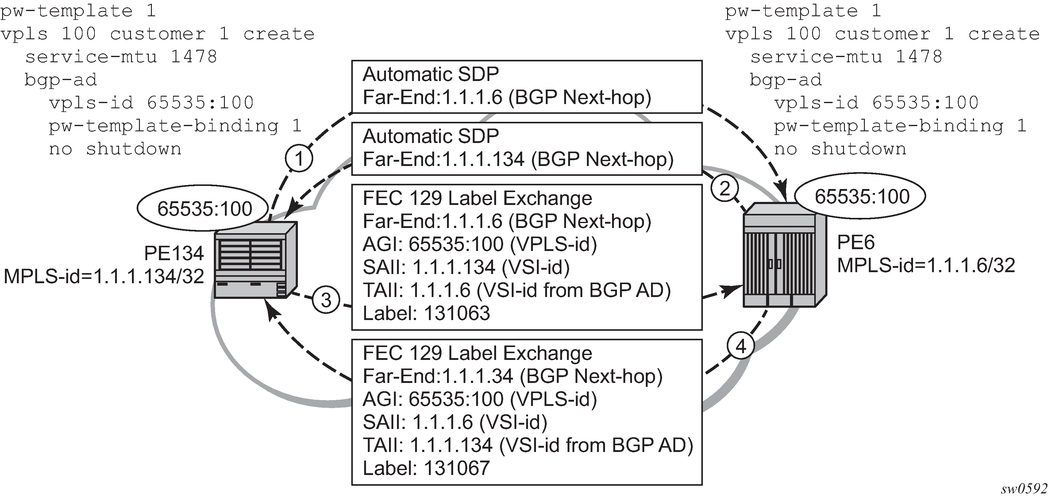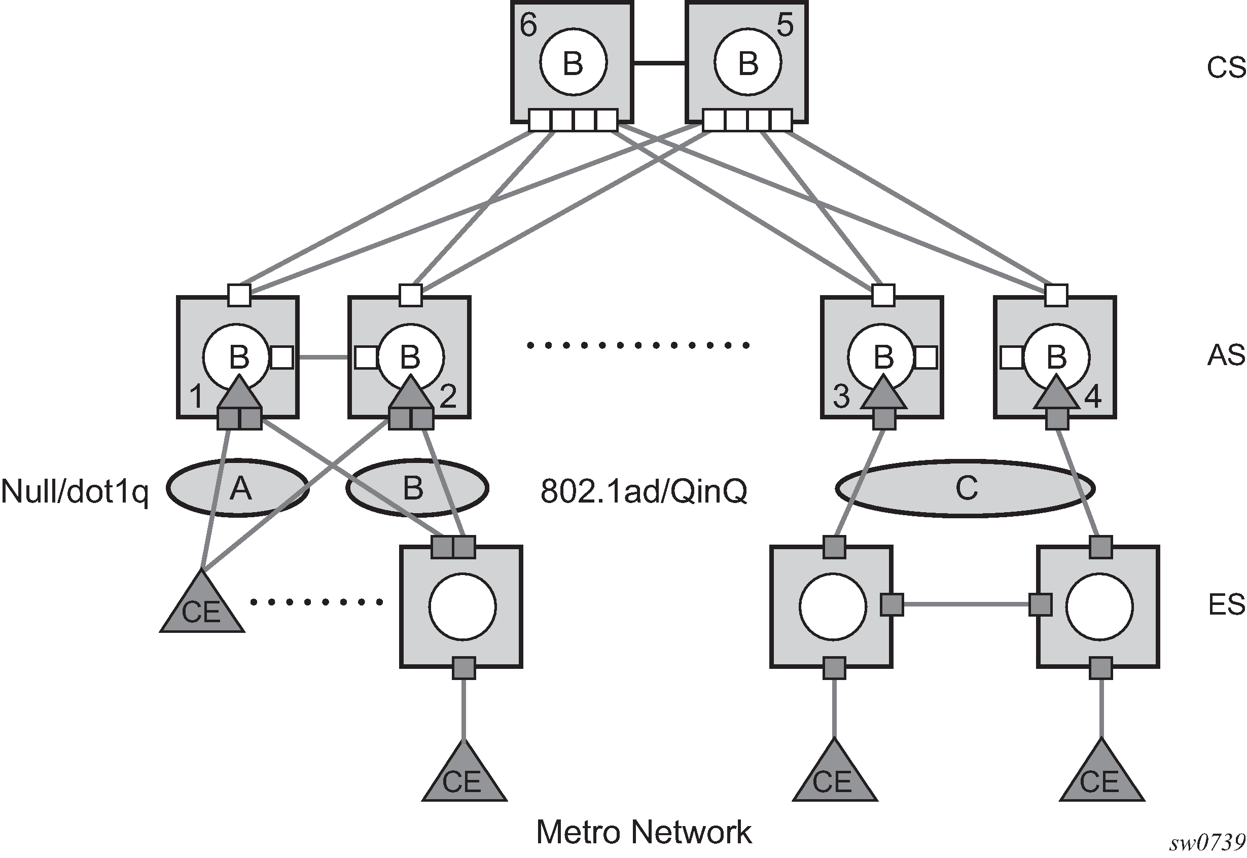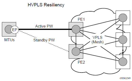 The VPLS architecture proposed in draft-ietf-ppvpn-vpls-ldp-0x.txt specifies the use of provider equipment (PE) capable of learning, bridging, and replication on a per-VPLS basis. The PE routers that participate in the service are connected using MPLS Label Switched Path (LSP) tunnels in a full-mesh composed of mesh SDPs or based on an LSP hierarchy (Hierarchical VPLS (H-VPLS)) composed of mesh SDPs and spoke-SDPs. The 7210 SAS supports only H-VPLS. Multiple VPLS services can be offered over the same set of LSP tunnels. Signaling specified in RFC 4905 is used to negotiate a set of ingress and egress VC labels on a per-service basis. The VC labels are used by the PE routers for de-multiplexing traffic arriving from different VPLS services over the same set of LSP tunnels.