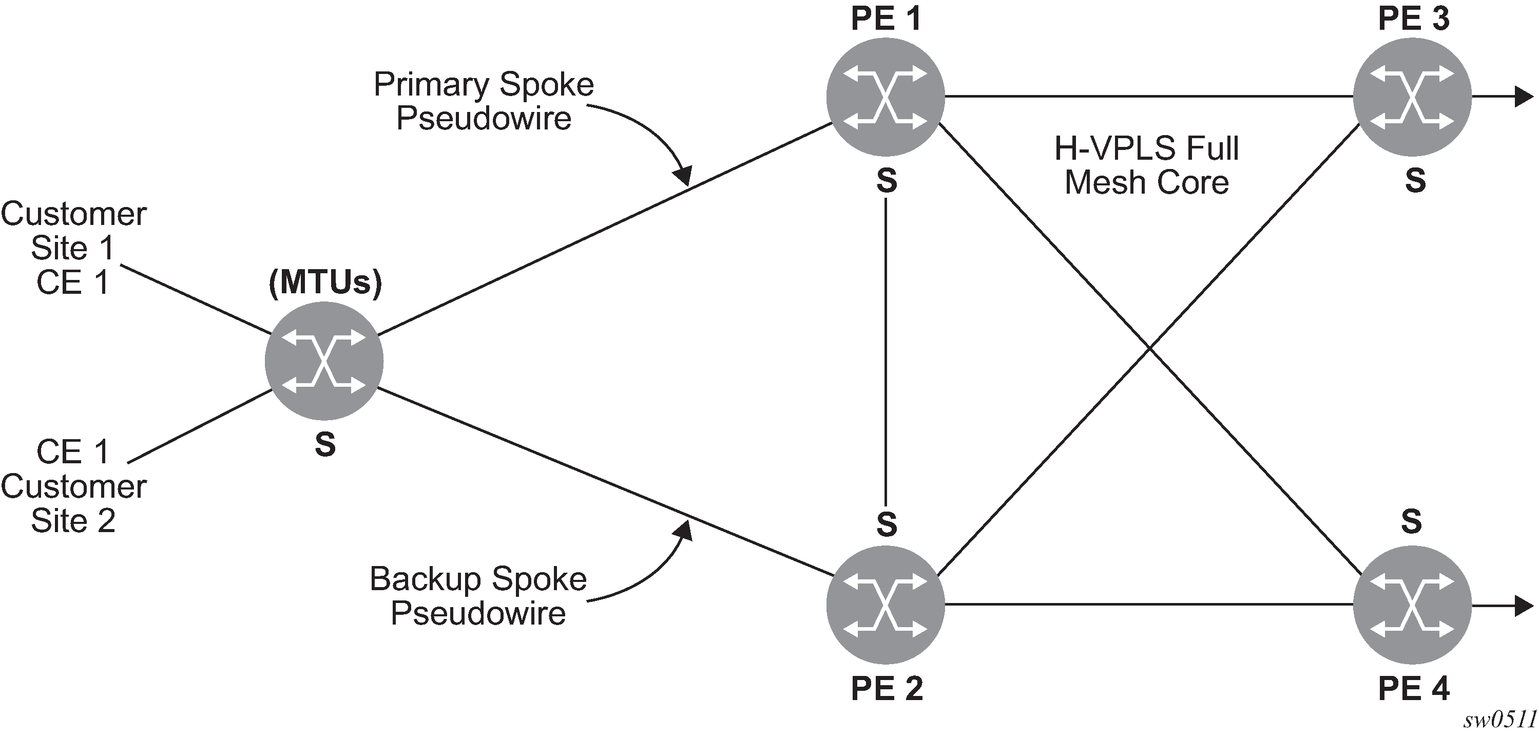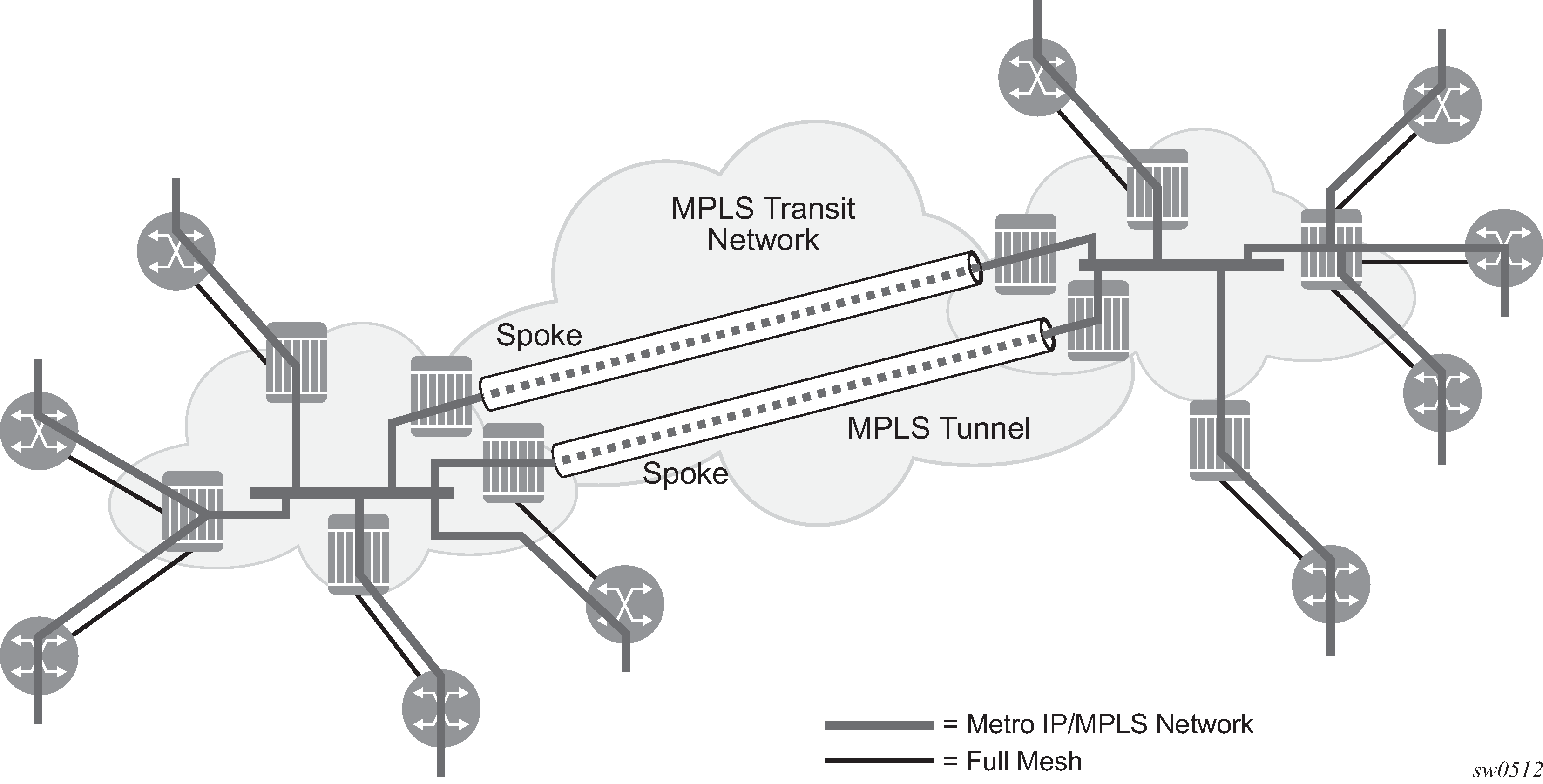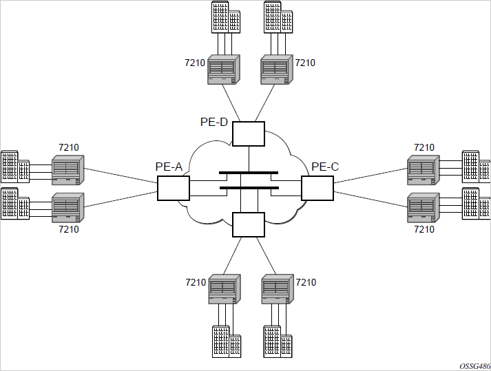 Connecting 7210 SAS to bridging-capable provider edge (PE) routers through a mesh/spoke-SDP. The PE routers are connected using a full mesh of LSPs.