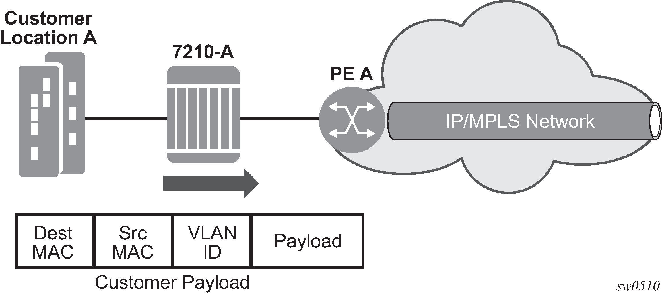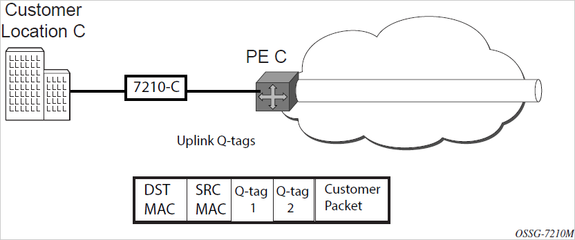 If the destination MAC address has been learned by 7210-C, an existing entry in the FIB table identifies the local access port and the IEEE 802.1Q tag (if any) to be added before sending the packet to customer Location-C. The egress Q tag may be different from the ingress Q tag.