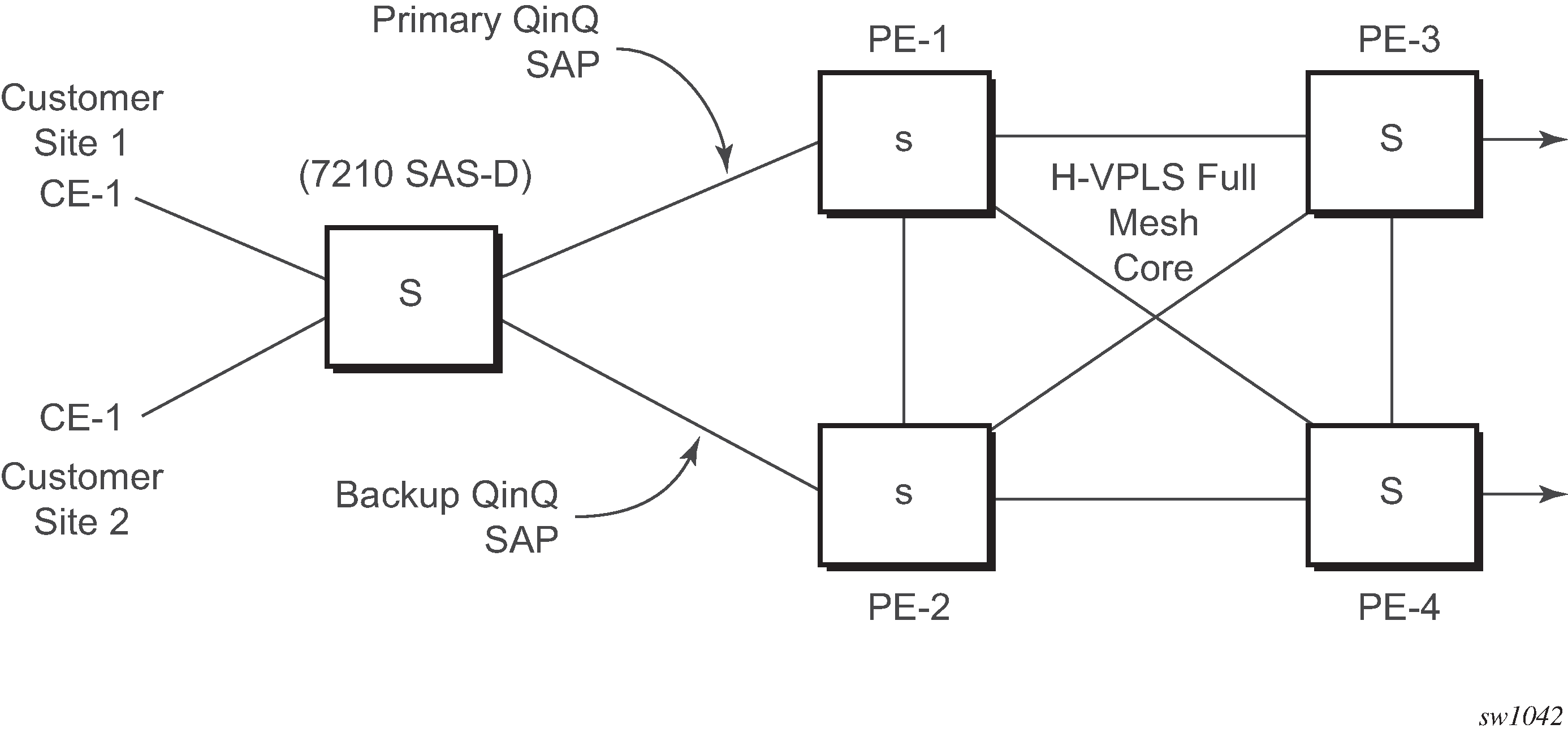 All 7210 SAS platforms supported in this document support QinQ SAPs or Dot1q SAPs that allows them to connect to upstream PE nodes providing IP/MPLS transport.