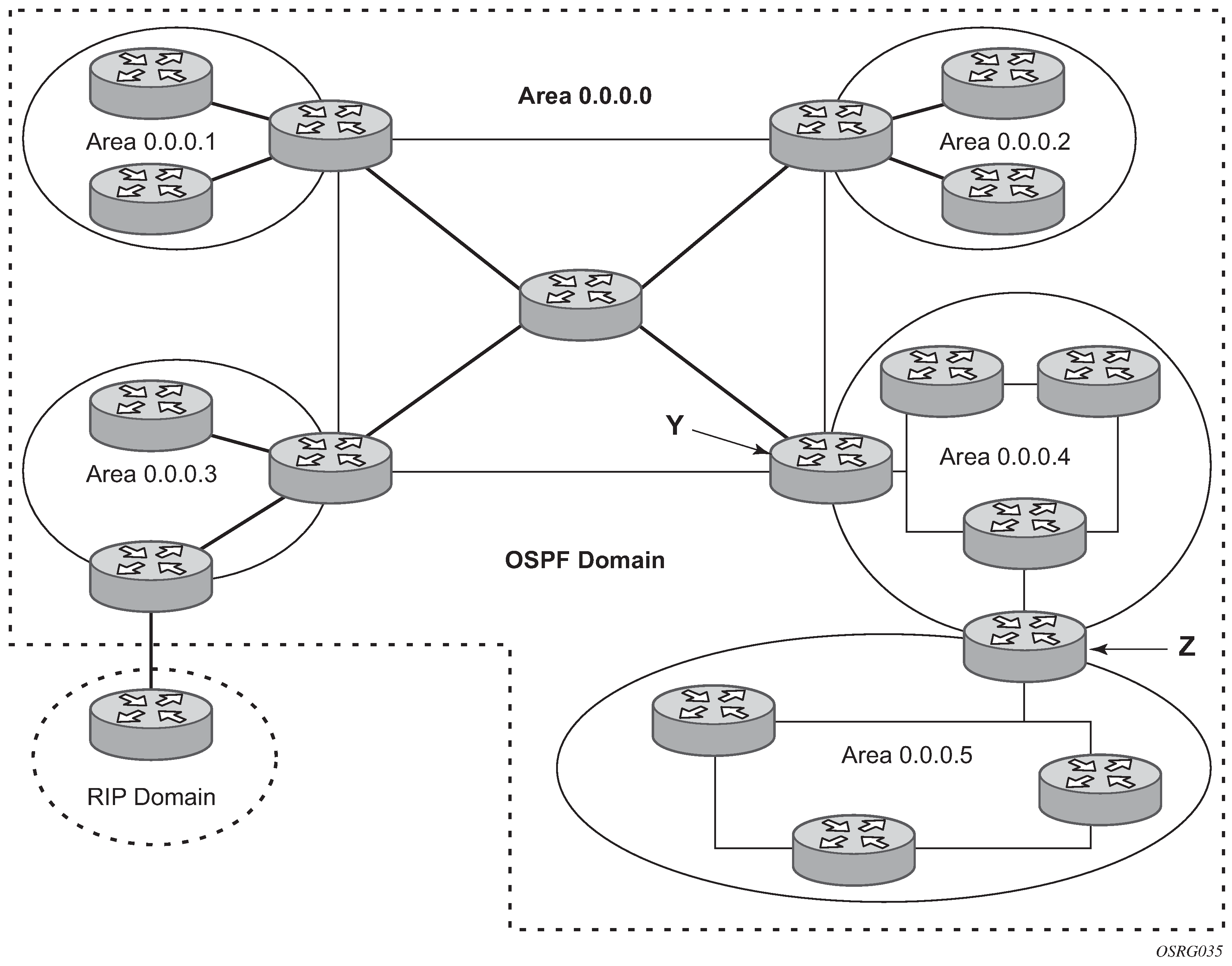 The OSPF backbone area, area 0.0.0.0, must be contiguous and all other areas must be connected to the backbone area. The backbone distributes routing information between areas. If it is not practical to connect an area to the backbone (see area 0.0.0.5 in the following figure), the ABRs (such as routers Y and Z) must be connected via a virtual link. The two ABRs form a point-to-point-like adjacency across the transit area (see area 0.0.0.4).