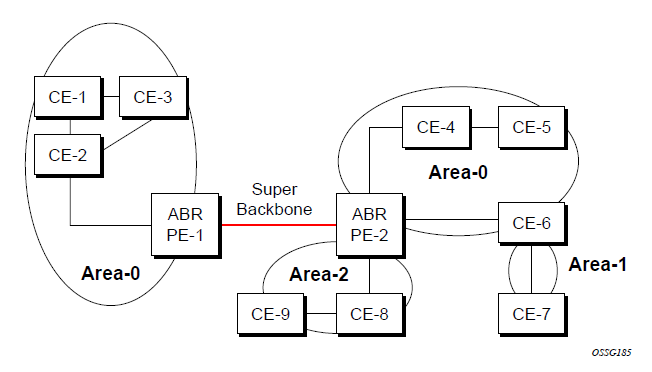 The MPLS VPN super backbone behaves like an additional layer of hierarchy in OSPF. The PE-routers that connect the respective OSPF areas to the super backbone function as OSPF Area Border Routers (ABR) in the OSPF areas to which they are attached. To achieve full compatibility, they can also behave as AS Boundary Routers (ASBR) in non-stub areas.